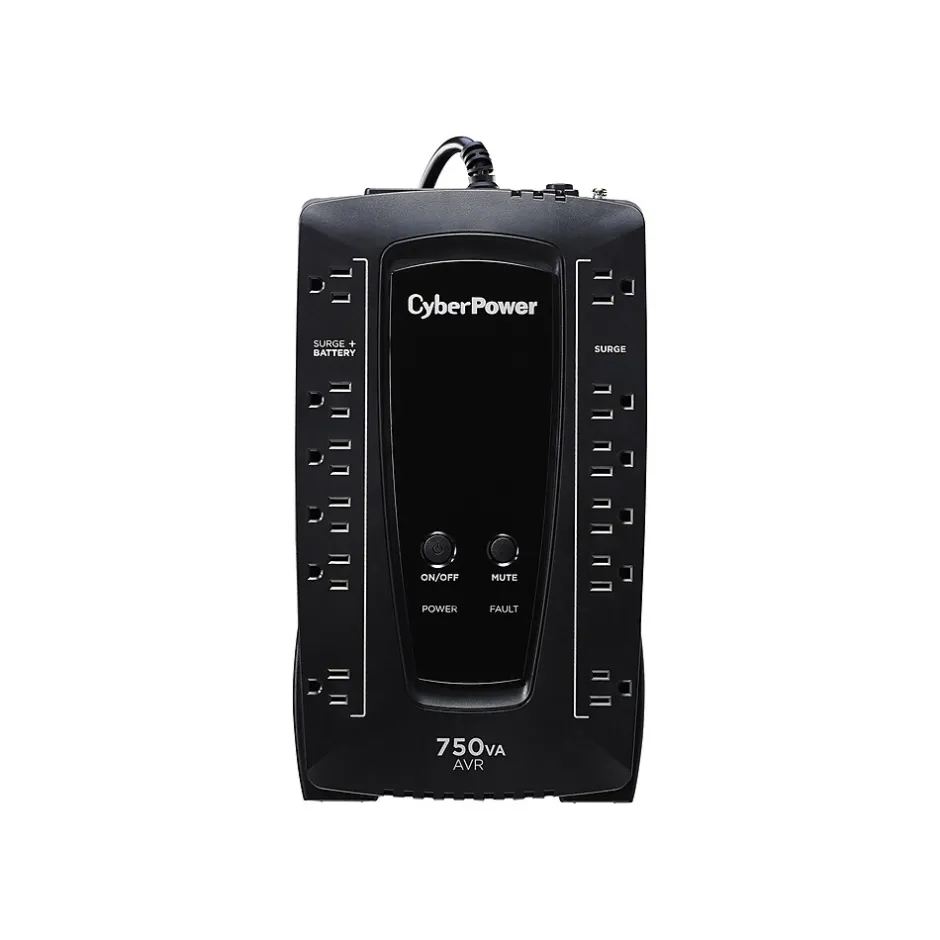 The CyberPower AVR Series AVRG750U uninterruptible power supply (UPS) safeguards PCs and other electronics (monitors, cable DSL/ modems, VoIP routers, and home theater devices) from blackouts, brownouts, surges, spikes, sags, and other power abnormalities. Its Automatic Voltage Regulation (AVR) boost/buck technology delivers a consistent and clean AC power, protecting connected equipment and preventing costly business interruptions. Its composite integrated circuitry offers advanced lightning protection. This UPS system is ENERGY STAR qualified with patented GreenPower UPS Bypass circuitry to save on energy costs by reducing energy consumption and heat buildup. The AVRG750U unit has a capacity of 750VA/450Watts, twelve (12) NEMA 5-15R receptacles, including, six (6) battery and surge protected and six (6) surge protected outlets. Its compact design allows for horizontal or vertical placement, or it can be mounted on a wall. This UPS has a 12-volt maintenance-free sealed lead acid battery. Protection for phone/network (RJ11) is also included. EMI/RFI filters increase the immunity of the load to disturbances and surges. A HID compliant USB port provides connectivity to the AVRG750U. PowerPanel Personal Edition UPS Management software is included to monitor the vitals of the UPS and will safely shutdown the system in case of a power outage. A Three-Year Warranty ensures that this UPS has passed our highest quality standards in design, assembly, material or workmanship and further protection is offered by a $150,000 Connected Equipment Guarantee.