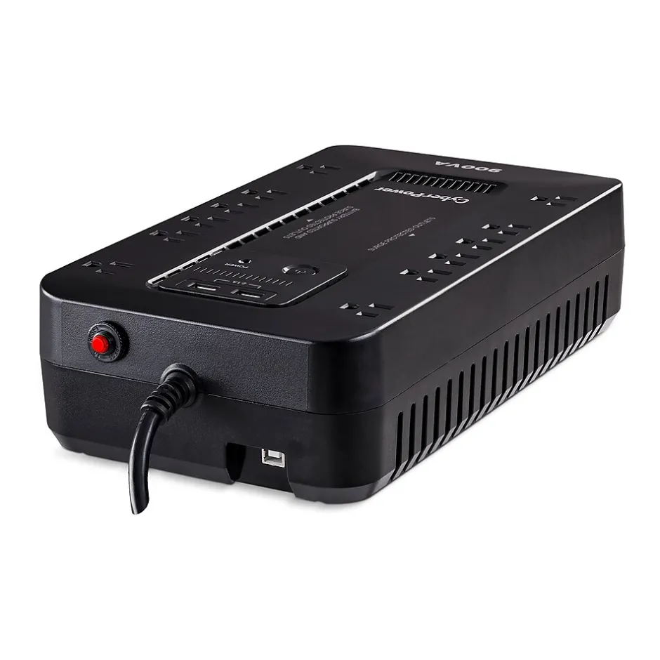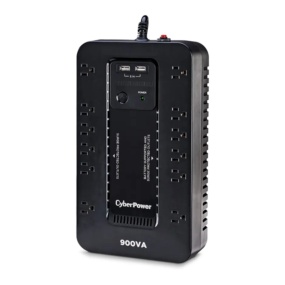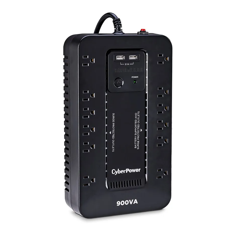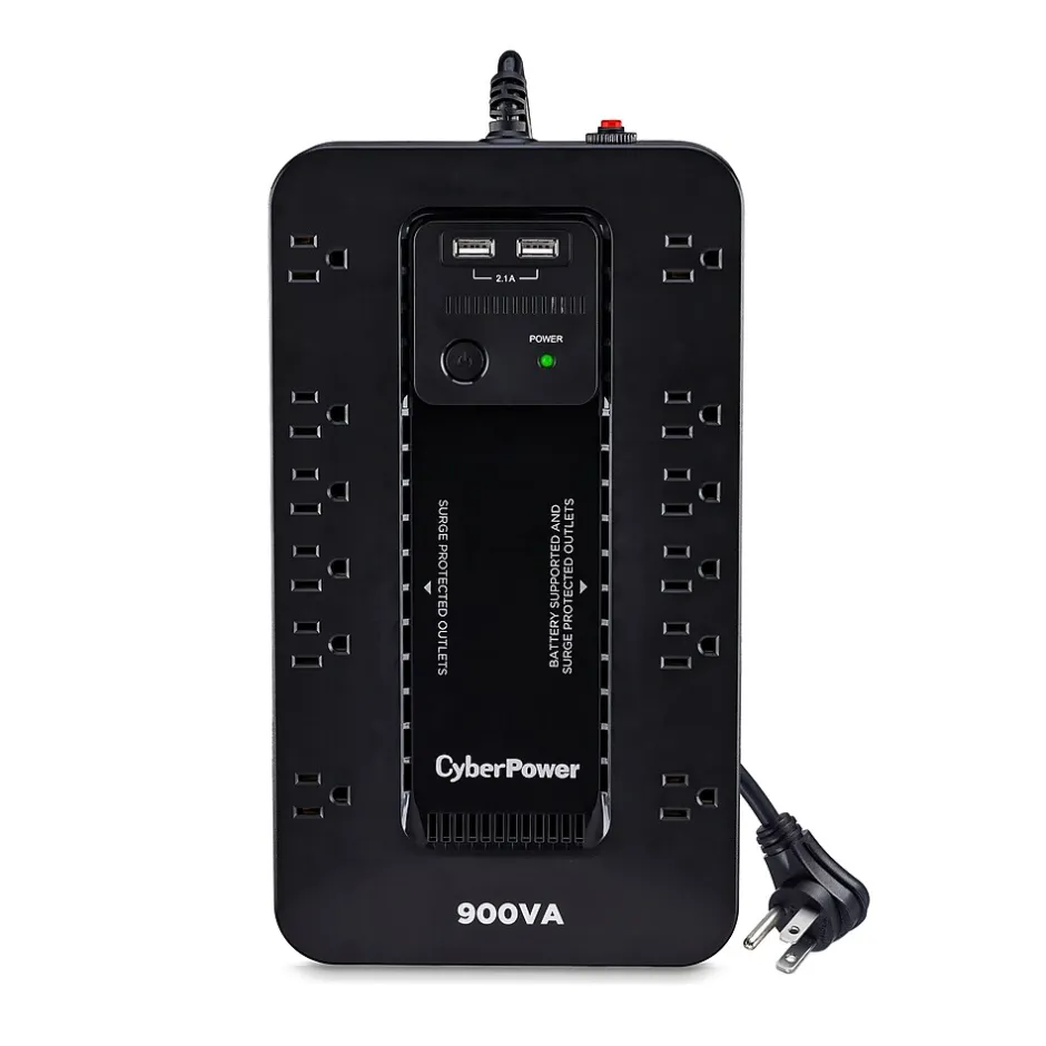 The CyberPower ST900U uninterruptible power supply (UPS) system provides battery backup and surge protection for lightning-induced surges and other power events that can damage electronic equipment. This unit delivers enough battery backup to power connected electronics through utility power failure and enough runtime to perform a graceful shutdown to protect against the loss of data and damage to valuable electronics during longer outages. The ST900U has two USB charging ports with 2.1 amp shared total output which gives you a faster charging time. This unit is designed to minimize noise for a quieter work environment and to run efficiently to reduce power consumption. Including a sleek design, this UPS is perfect for all your home office and entertainment needs, including computers, gaming consoles, and broadband routers.