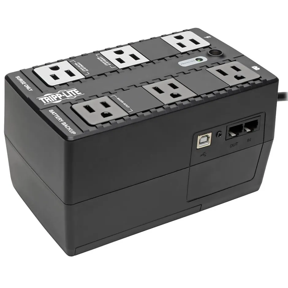Tripp Lite ECO Series 350 VA 6-Outlet UPS with built-in outlets to provide protection against blackouts/brownouts/transient surges to printers, scanners and speakers when computer is not in use.