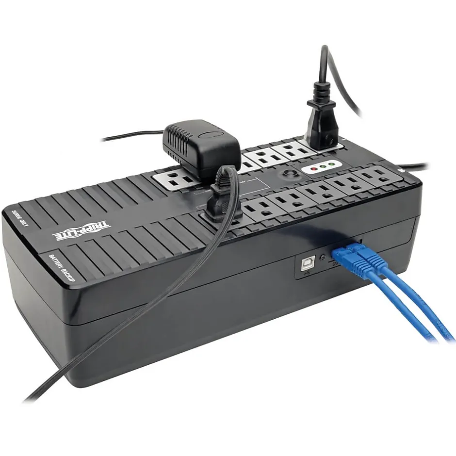 Tripp Lite ECO Series 750 VA 12-Outlet UPS with built-in outlets to provide protection against blackouts/brownouts/transient surges to printers, scanners and speakers when computer is not in use.
