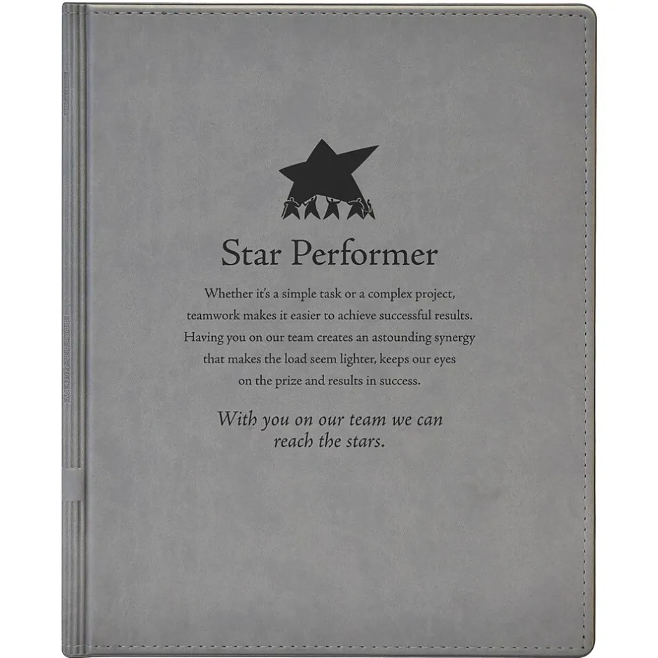 Baudville® Executive notepad holder has an inside pocket with clear sleeve for business card and a pen loop. Notepad holder facilitates personalization and imprinting of ” Star Performer” message. Notepad holder has 100 lined paper sheets.