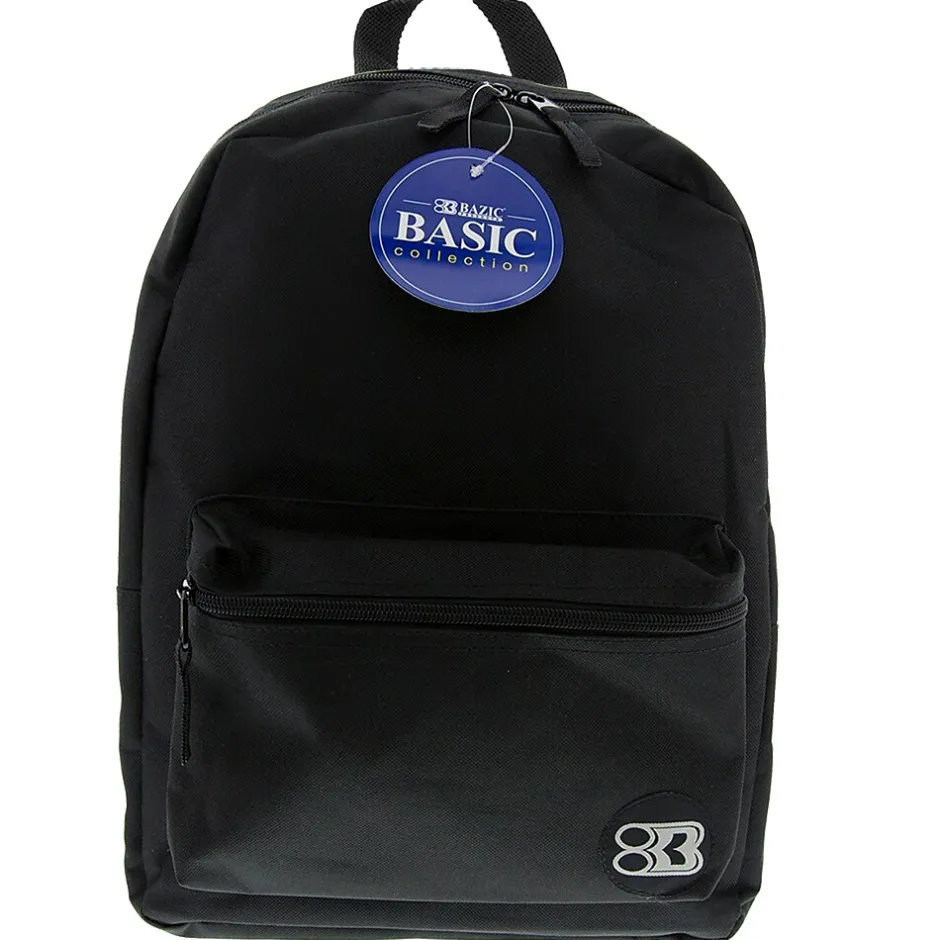 - Solid black polyester backpack