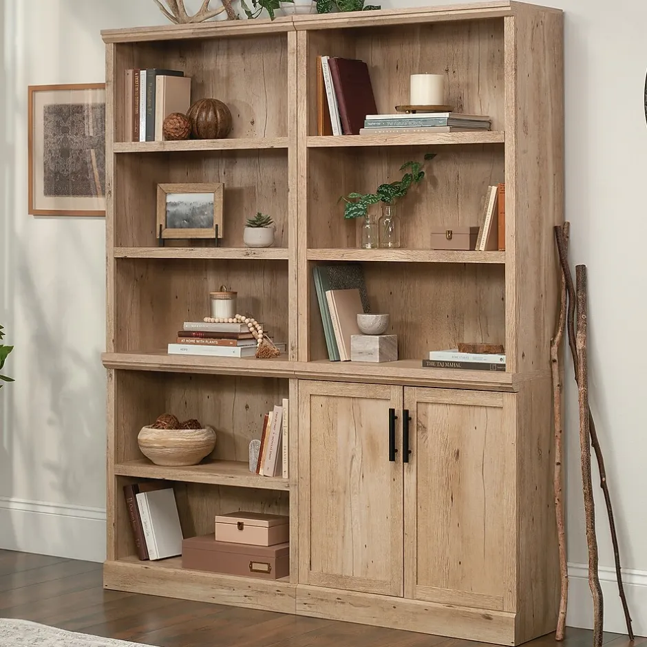 Bring classic beauty and chic cottage style to your home decor with this library bookcase with doors from the Aspen Post collection. The upper portion of this 5-shelf bookcase features two spacious adjustable shelves that are perfect for storing and displaying anything from your collection of novels, storage bins, and children’s books to photos of your family, decorative plants, and collectibles. Behind the double doors of the tall bookshelf is an additional hidden storage area that contains a third adjustable shelf so you can stow away any other seasonal home essentialsthe things that guests will never see. The charming style and convenient functionality make this library bookcase a perfect fit for your living room, office or even in the bedroom. It also features cord access through the enclosed back panel so that all your electrical cords and wires are organized neatly and out of sight. Finished in the light and neutral Prime Oak and accented with black hardware, this quaint farmhouse style bookcase with doors gives your home the bright new look you’ve been waiting for.