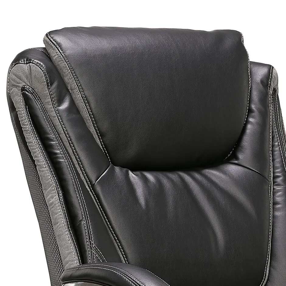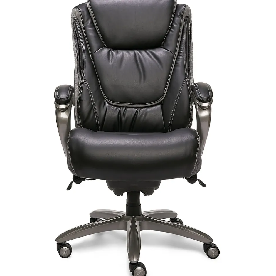 The Serta Big & Tall executive office chair brings the legacy of quality, comfort, and style to your office. Specialized premium foam makes up the smart layers that are placed over individual pocketed ComfortCoils, offering pressure-relieving comfort and optimized support for an unrivaled seating experience. The deep, layered body pillows on this leather office chair wrap you in softness, creating a plush feel that takes you comfortably through your day. Designed to help alleviate strain and discomfort, this ergonomic office chair has an elevated headrest to support your neck. This big and tall office chair accommodates up to 350 lbs. and has a generous, roomy seating area, so you can stay focused and productive without feeling constricted. Commercial-grade components like an extra-large steel plate and thicker plywood ensure this heavy-duty office chair stands up to heavy use. A great addition to your executive workspace, this Serta office chair is finished in a supple bonded leather for a commanding style that highlights success.