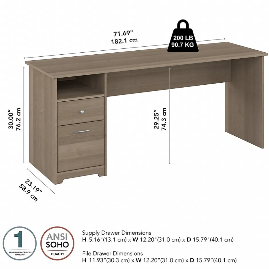 The Bush Furniture Cabot 72W Computer Desk with Drawers presents a home office solution with transitional style. Take advantage of the 72-inch desk surface to spread out with a computer, books, and all the materials you need to power through your next project or assignment. The durable desktop supports up to 200 pounds and includes built-in wire management to keep cords and cables out of the way while you work. A single file drawer opens on smooth full-extension ball bearing slides for an effortless reach to letter, legal, and A4-size paperwork. The box drawer organizes writing utensils, notepads, and other small office supplies while the open cubby shelf is perfect for work-in-progress and frequently used materials. This home office desk with storage has been rigorously tested to meet or exceed ANSI/SOHO quality standards for safety and performance and is backed by a 1 Year Warranty.