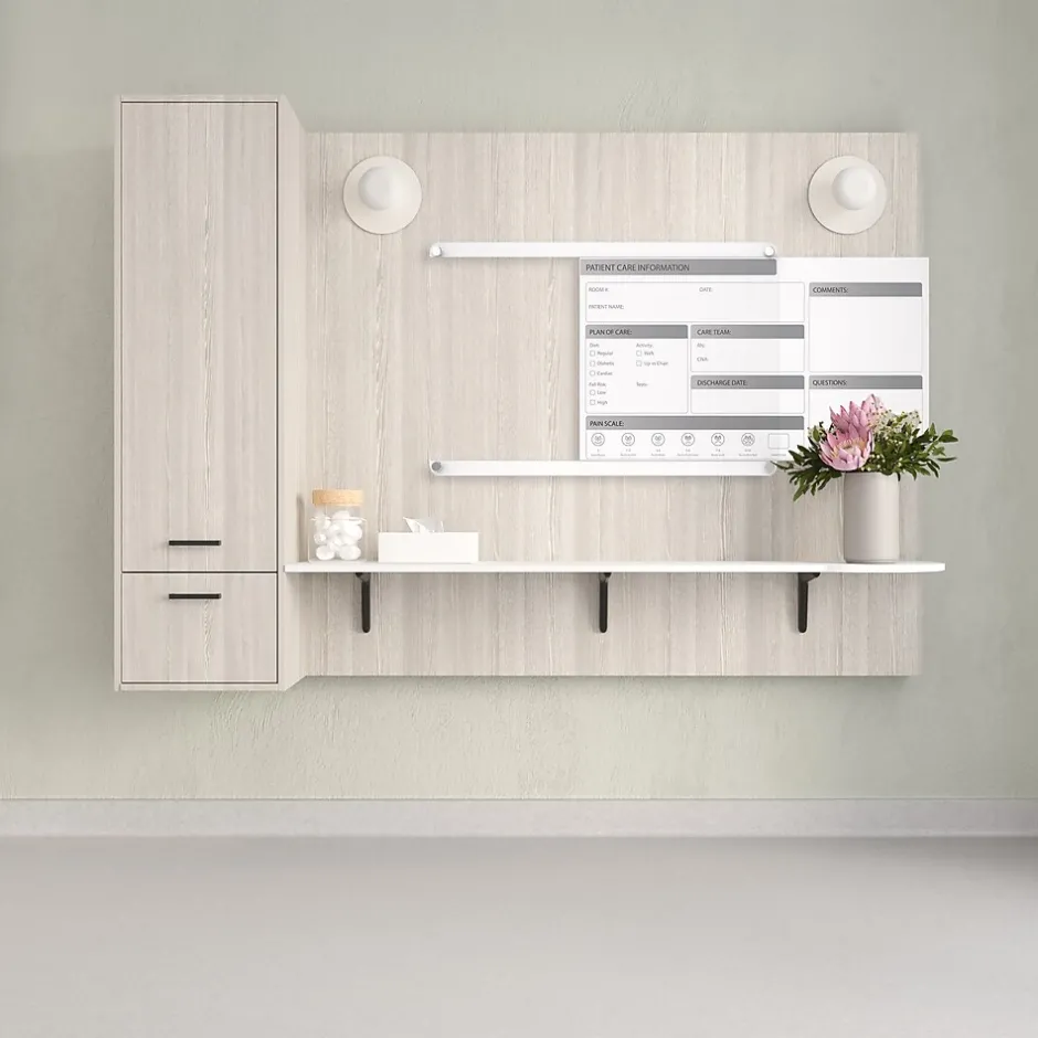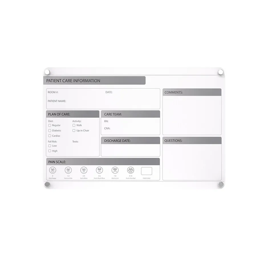 Ghent’s Slide Changeable Patient Room Glassboards are the perfect communication tool for patient care in any healthcare environment. The interchangeable patient communication board comes with a sleek and easy to disinfect glass surface and a changeable, double-sided patient information graphic insert, that can slide to the left or right, to switch between English and Spanish for versatility for effective engagement between patients and care providers. With the look of permanent graphics, the interchangeable insert makes the board flexible, perfect for the ever-changing healthcare environment. Hospital communication boards are a great option for patient rooms to engage in effective communication between nurses, doctors and patients. Patient room boards can help improve HCAHPS and patient satisfaction scores for your hospital. They allow you to showcase different care plans or multiple languages with a removable insert that is easily replaced if branding or initiatives change. Ghent changeable patient room glassboard featured 1/4″ tempered safety glass with radius corners and tamper-resistant standoffs. Glassboards are ideal for healthcare as they withstand high-use and do not ghost or stain, ensuring sensitive patient information is not left behind. Patient room boards are shipped to you in Ghent’s worry-free packaging, designed specifically for shipping glassboards.