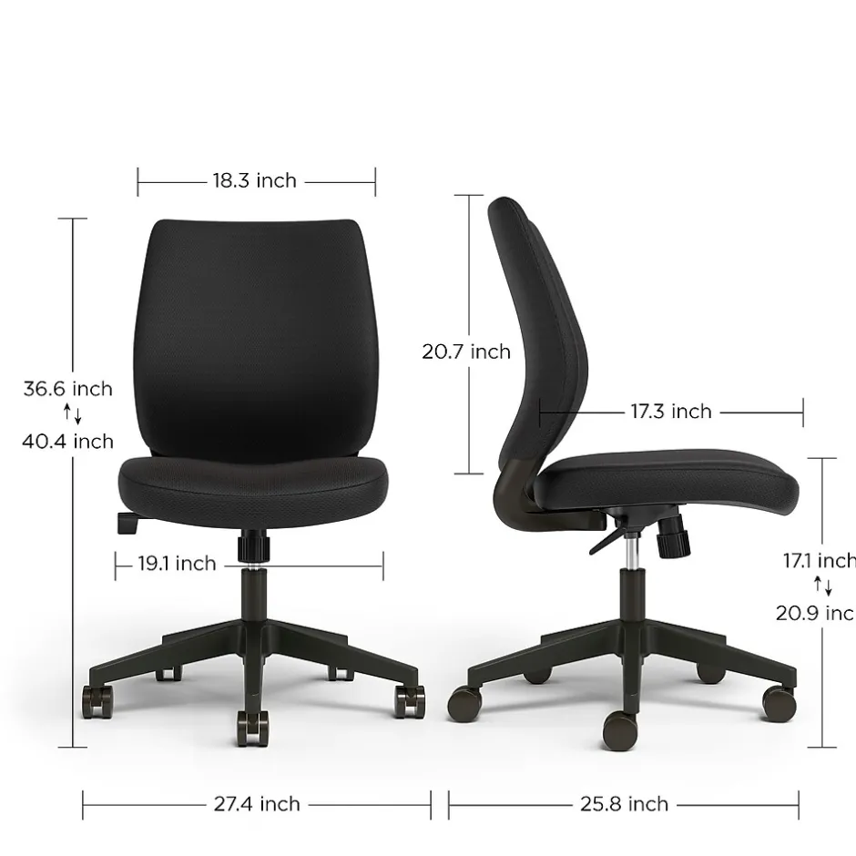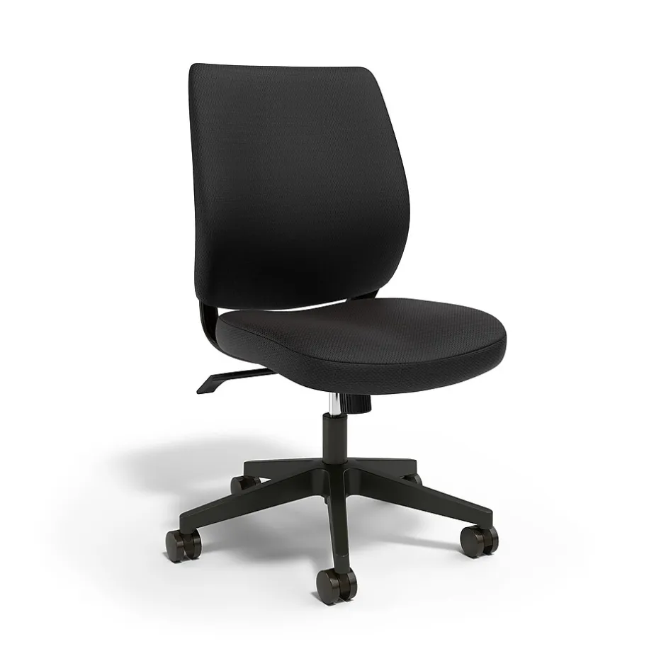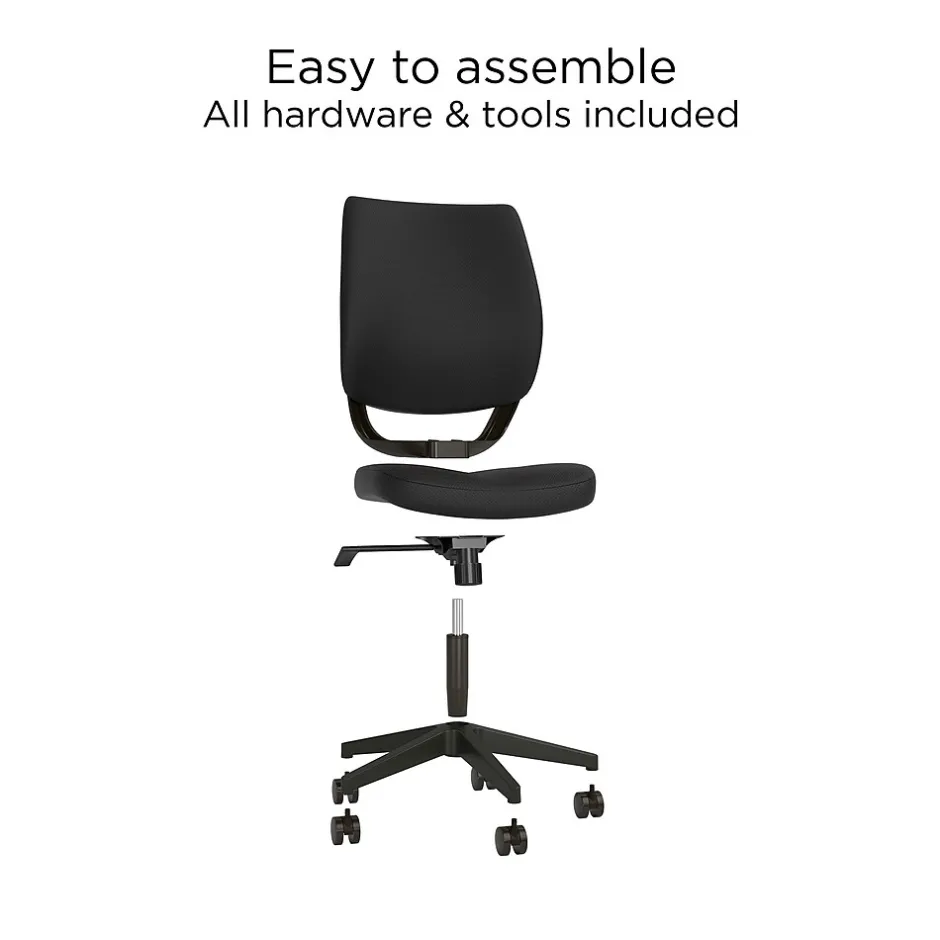 Get a sturdy seating solution for your office with this armless fabric chair. Five 360-degree caster wheels enable effortless movement around your work area, while the fabric upholstery offers durability and brings a clean look to your workstation. The armless design lets you optimize office space, and the contoured padded seat delivers plush comfort during long working hours. An adjustable seat height allows customization to suit different needs, while the included tilt knob easily supports a reclined position. This Essentials black fabric chair meets ANSI/BIFMA standards for reliable performance and safety, and the tilt lock feature lets you unlock or lock your chair in an upright position.