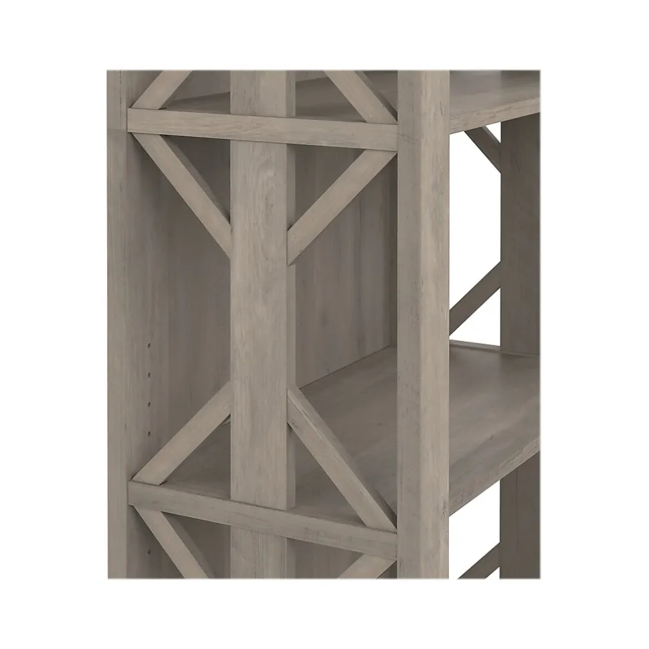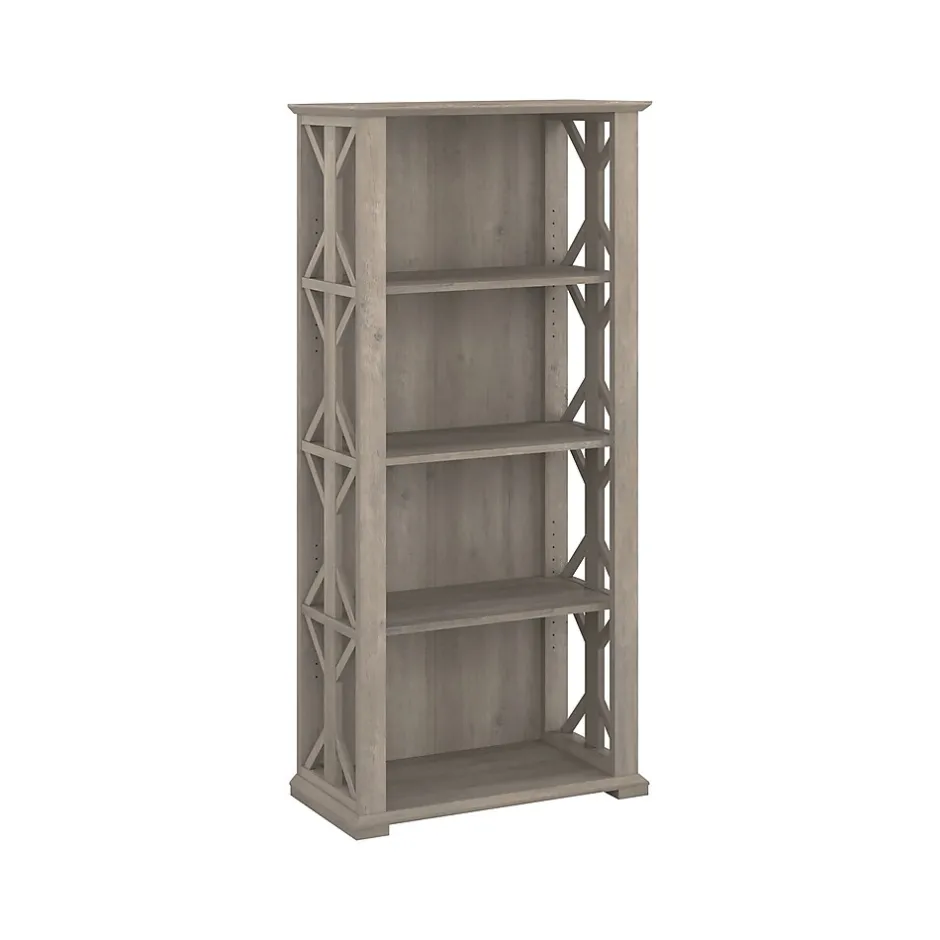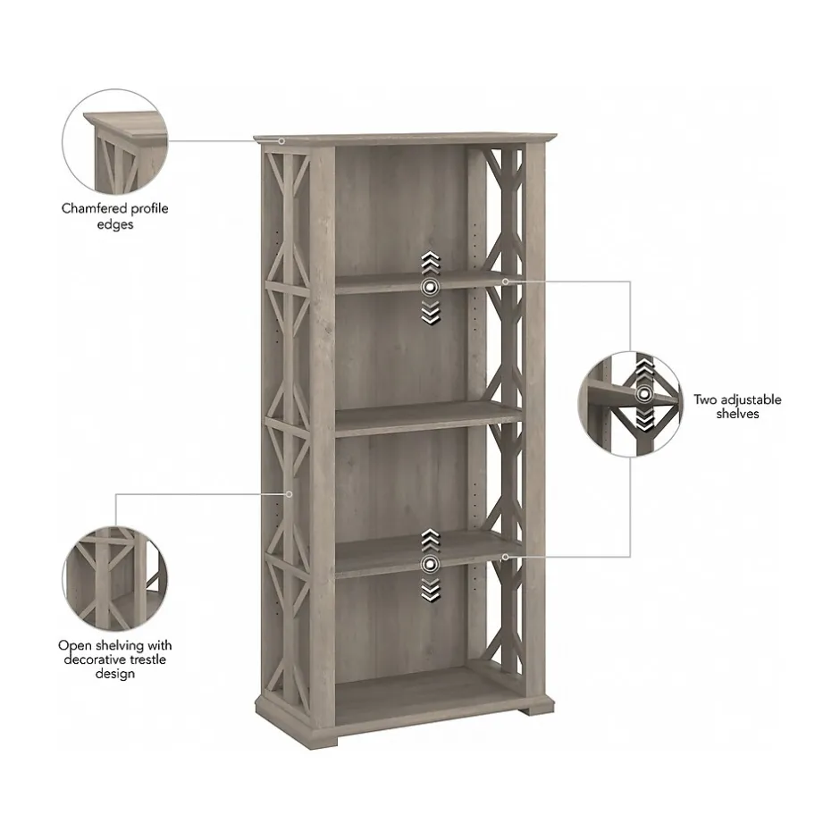 Organize books or give your workspace a personal touch with the Bush Furniture Homestead four-shelf farmhouse bookcase. Safely display pictures and decorations on shelves that support up to 50 lbs. each. Two shelves are fixed for stability, while two can be raised or lowered to accommodate items of various sizes. Tip Guard safety features include a stable design and wall attachment hardware for family-friendly safety in any space. The bookcase has been tested with a 50 lbs. hanging weight to create a safe environment in any work or living space. The decorative trestle pattern and chamfered profile edges give this bookcase a casual farmhouse style. This bookcase has been meticulously tested to meet or exceed the ANSI/SOHO quality standards for safety, durability, and performance and is backed by a 1-year manufacturer warranty. See the full collection for coordinating items.
