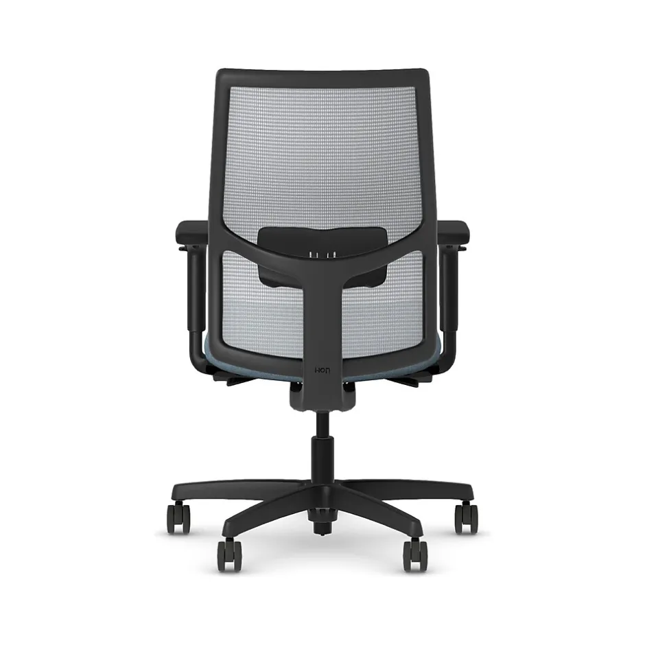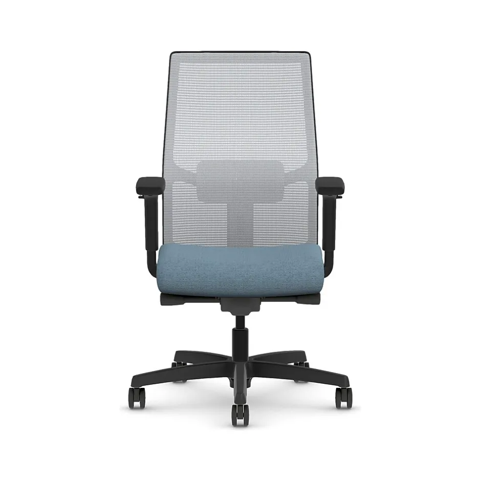 - Four-way stretch mesh back in fog gray, Hamilton Carolina blue fabric seat, and black frame