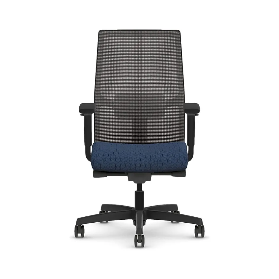 - Four-way stretch mesh back in black, Apex navy fabric seat, and black frame