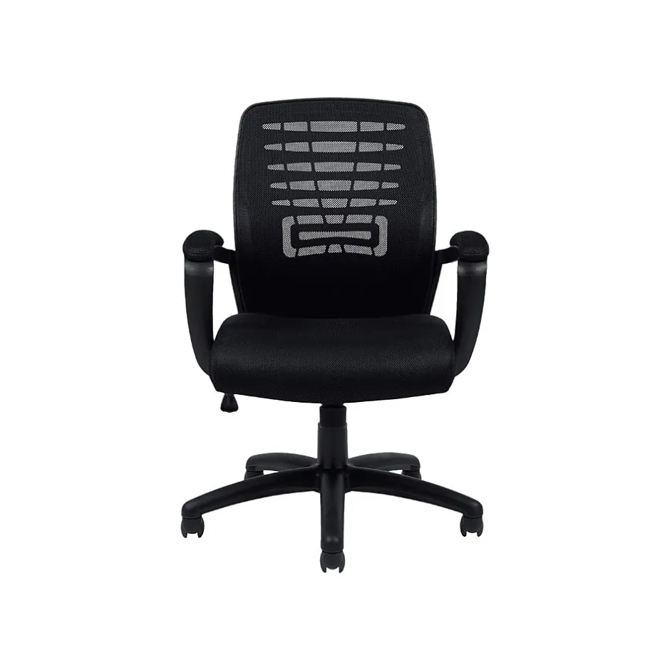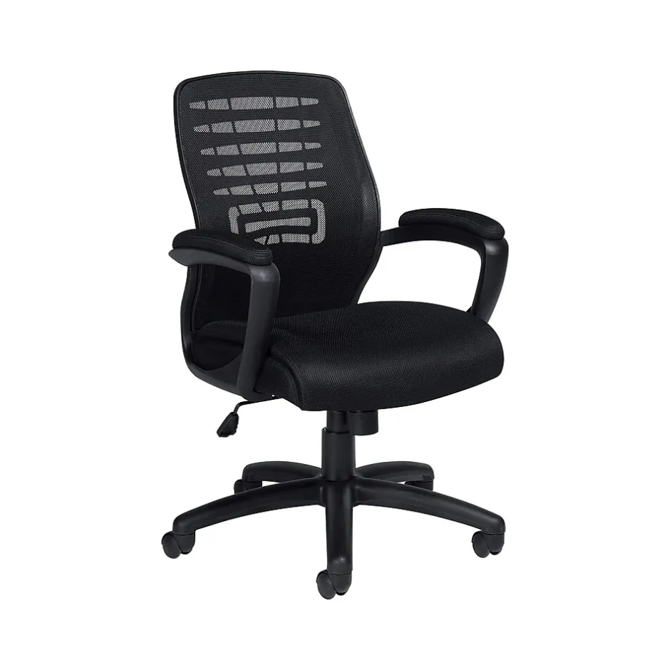 Go easy on your joints with this Offices To Go black mesh manager’s chair. The back is made with synthetic mesh fabric for lightweight breathability and comfort, while the swivel and tilt features let you customize the chair to fit your body perfectly. This chair features a scuff-resistant arched base and twin-wheel carpet casters for easy rolling across multiple surfaces. With a generously proportioned waterfall-shaped seat that alleviates stress on your knees and the padded adjustable armrests that provide support for your elbows and shoulders, this Offices To Go black mesh manager’s chair is ideal when you’re working long hours at a desk or computer.