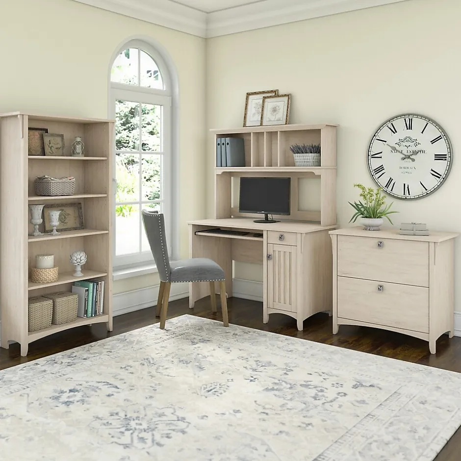The Bush Furniture Salinas Small Computer Desk with Hutch takes timeless Mission styling and adds plenty of modern touches to help you complete your daily tasks. Technology-ready features include a pullout keyboard tray or laptop shelf and a work surface with built-in wire management to keep cords and cables in order. The Hutch has plenty of storage space for work-in-progress, books, decorations and more while the 48W Desk features a vertical storage cabinet along with a box drawer to organize office supplies and writing utensils. An ideal Computer Desk for small spaces, the compact design boasts a sturdy construction with clean lines, tapered legs and attractive wood detailing. The durable desktop supports up to 200 pounds and offers ample space to complete projects and assignments, pay bills, or surf the web. This home office desk set is backed by a 1 Year Manufacturer’s Warranty.