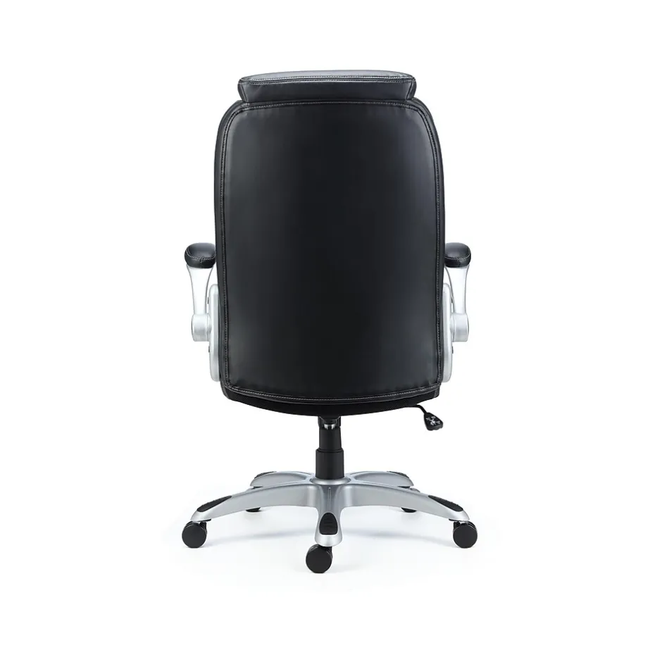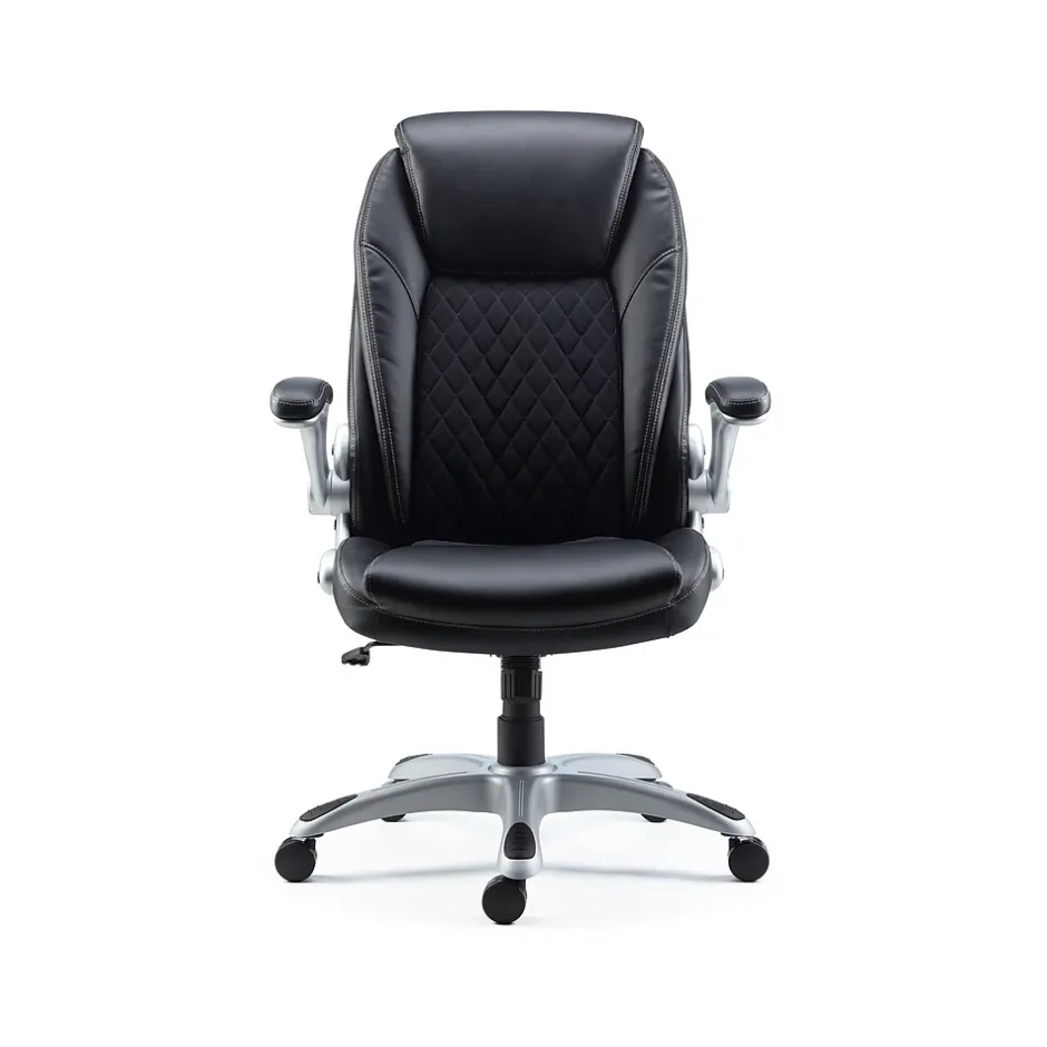 Outfit your executive office with this Sorina office chair. The soft quilted back and bonded leather accents deliver modern style, and the plush padding cradles your frame for all-day comfort. Built-in lumbar support and flip-up padded arms, making it easy to get in and out of the seat. Tilt tension, tilt lock and seat height adjustments provide convenient customization, so you can get the perfect fit for the busiest of workdays. Featuring a five-star base and sturdy rolling casters, this Sorina office chair glides effortlessly across office floors.