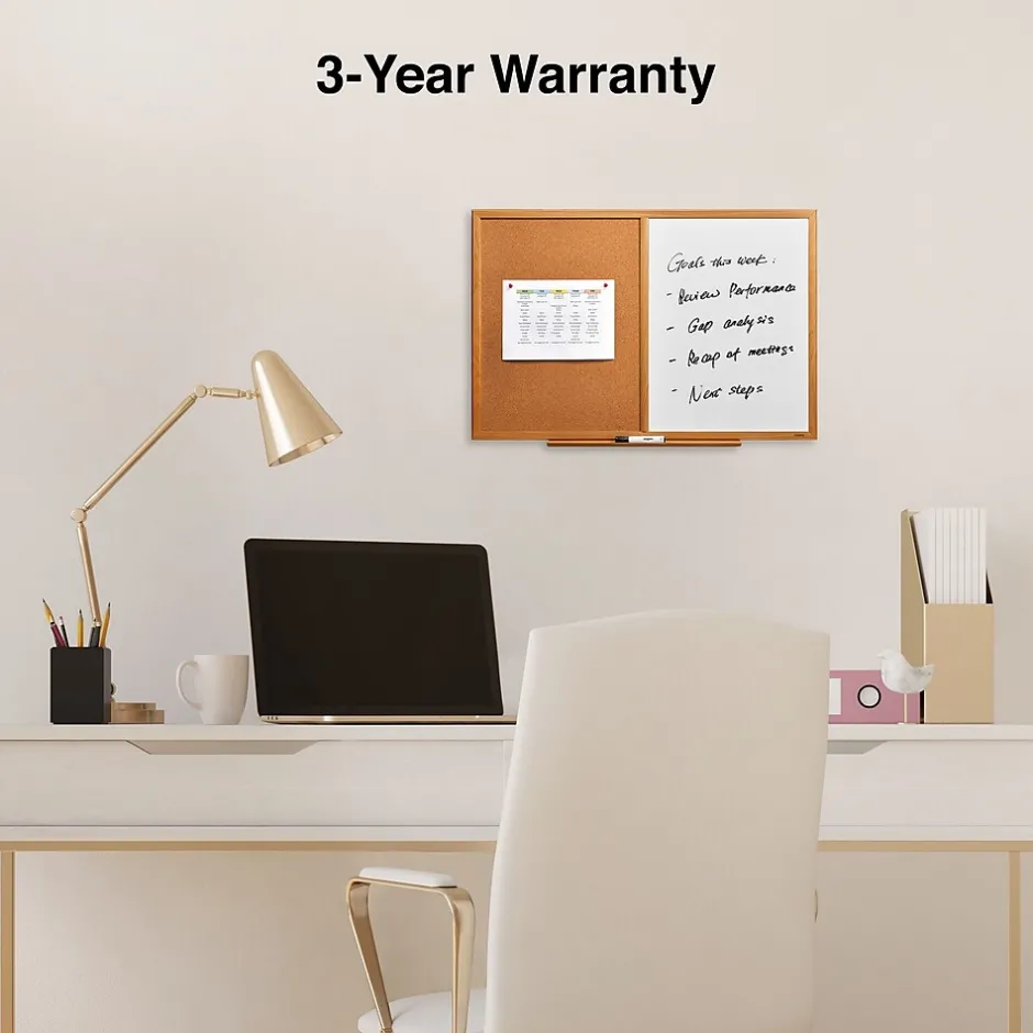 - Durable combo dry-erase and cork bulletin board offers a variety of messaging options