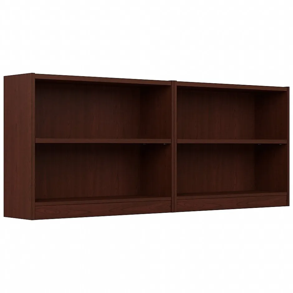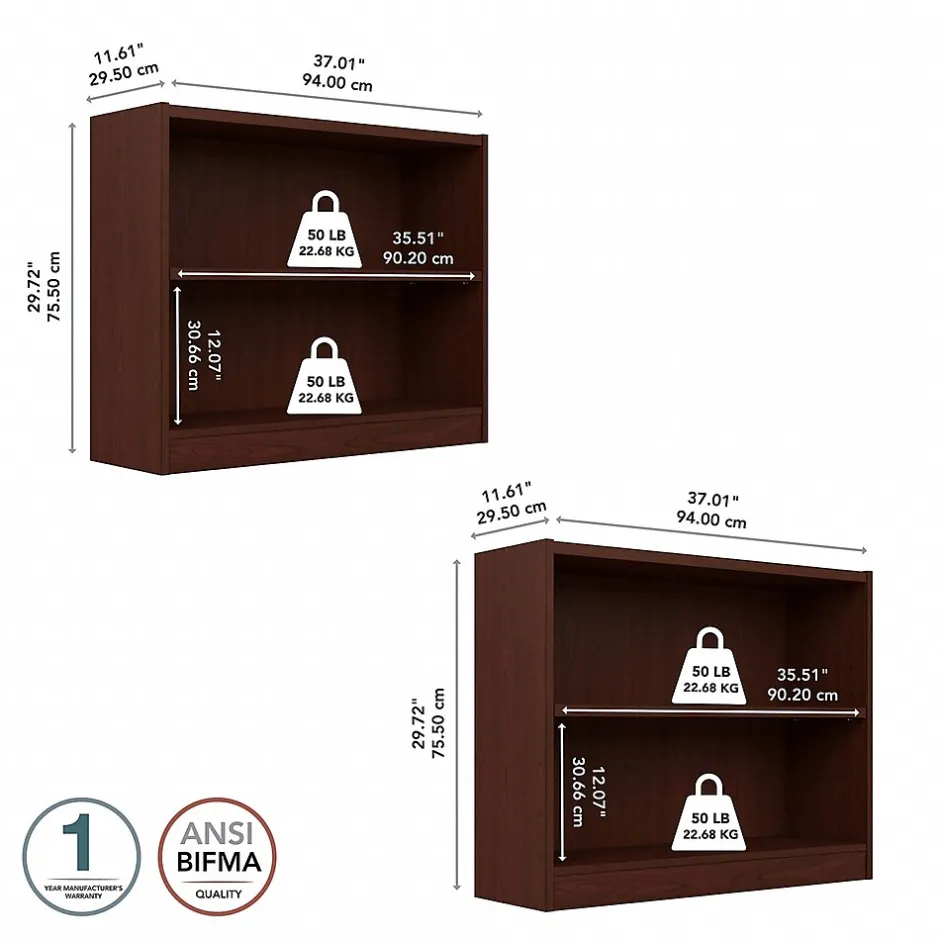 The Bush Furniture Universal Small 2 Shelf Bookcase – Set of 2 provides a versatile organization solution that makes it easy to show off your personal library or brighten up the room with pictures and decorations. A one-inch thick adjustable shelf prevents sagging and moves up and down to accommodate larger items like binders and photo albums while one fixed shelf gives the low bookcase added stability. Shelves have a weight capacity of 50 pounds each, so storing magazines, hardcover books, or vinyl records is never a problem. Tip Guard(TM) safety features include a stable design and wall attachment hardware for family-friendly safety in any space. This small bookshelf set meets ANSI/BIFMA quality standards for safety and performance and is backed by a 1 Year Warranty.