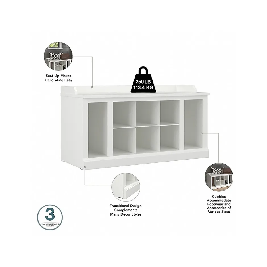 The Bush Furniture Woodland 40W Shoe Storage Bench with Shelves and Wall Mounted Coat Rack combines transitional styling and a practical design to offer an ideal entryway organizer. Have a seat on the durable bench surface and take a moment to relax as you get ready to head out the door or come home after a long day. The top of the mudroom bench supports 250 pounds, so you can sit down to put on and take off your shoes or set shopping bags down with confidence. Six cubby spaces and vertical shelves on either side keep footwear of all shapes and sizes in order. The wall shelf features six coat hooks for hanging jackets, hats, scarves and more. Smaller items like gloves and keys can be stashed neatly inside three open compartments. This entryway bench and coat rack has been tested to meet Bush Furniture’s standards for safety, performance and durability and is backed by a 3 Year Warranty.