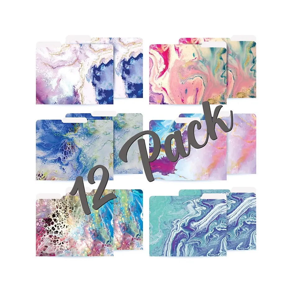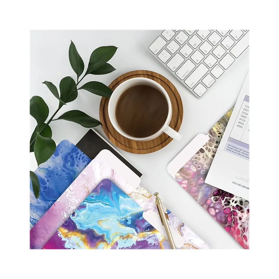 The Better Office Abstract Art fashion file folders come in six colorful designs printed on heavyweight (300 gsm) paper with a clear-coated finish for added durability and sheen. The 1/3-cut tabs allow a sizable amount of space for customization. Use in the office or at home to brighten your workspace and personalize your project folders.