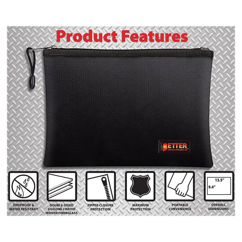 The Better Office fireproof document bag features a full-length zipper and holds legal-, letter-, and A4-size documents and other valuables such as jewelry, passports, thumb drives, and more. Tested and approved to withstand the harsh conditions associated with fire and water damage. Always close the zipper fully to minimize potential exposure. Do not immerse the bag to clean. Spot-clean with a damp cloth, as needed.