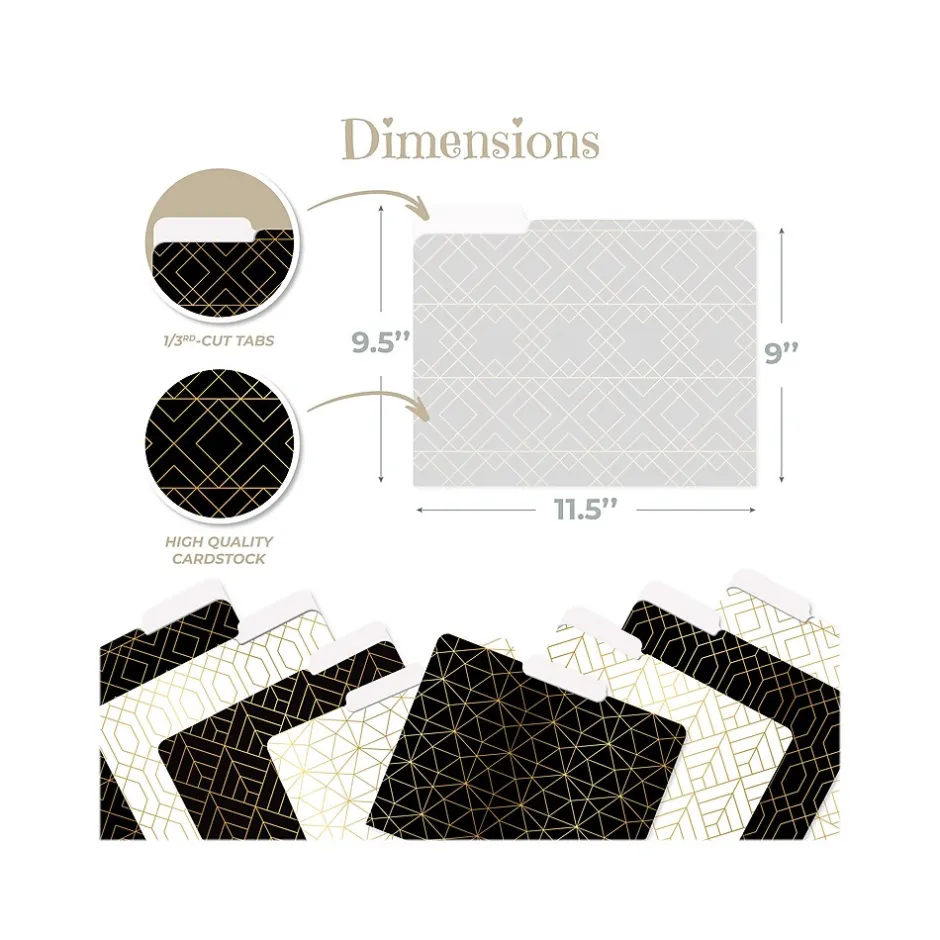 The Better Office Geometric Gold Foil fashion file folders come in four eye-catching designs on a white background and those same four designs on a black background. Made of heavyweight (300 gsm) paper with a coated finish for added durability and sheen. The 1/3-cut tabs allow a sizable amount of space for customization. Use in the office or at home to brighten your workspace and personalize your project folders.