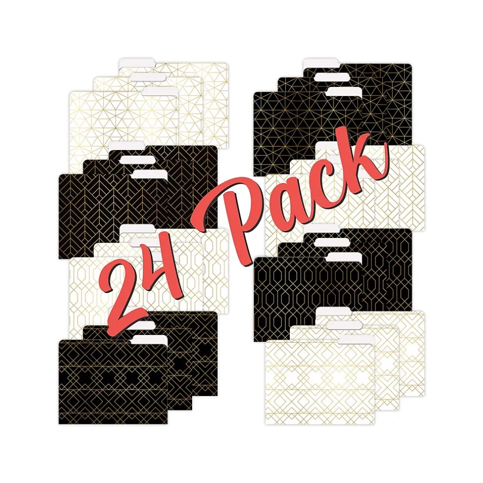 - Features unique prints of four eye-catching Geometric Gold Foil designs on a black background and white background (eight sets of three matching folders)