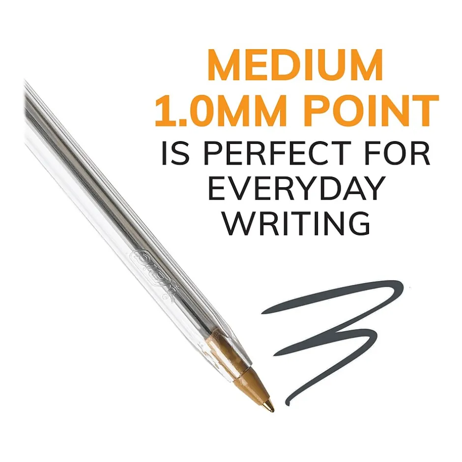 Combine exceptional performance and longevity with the BIC Cristal Xtra Smooth black ballpoint pen. The flexible 1.0 mm medium-point pen delivers crisp, legible lines, making this pen a superb choice for everyday writing activities. The pen minimizes blotting and skipping as the tungsten carbide ball helps the black ink spread evenly. The BIC Cristal Xtra Smooth pen has a snug, comfortable grip and a translucent hexagonal barrel that lets you see how much ink remains. The matching cap includes a handy clip for easy attachment to pockets or notebooks.