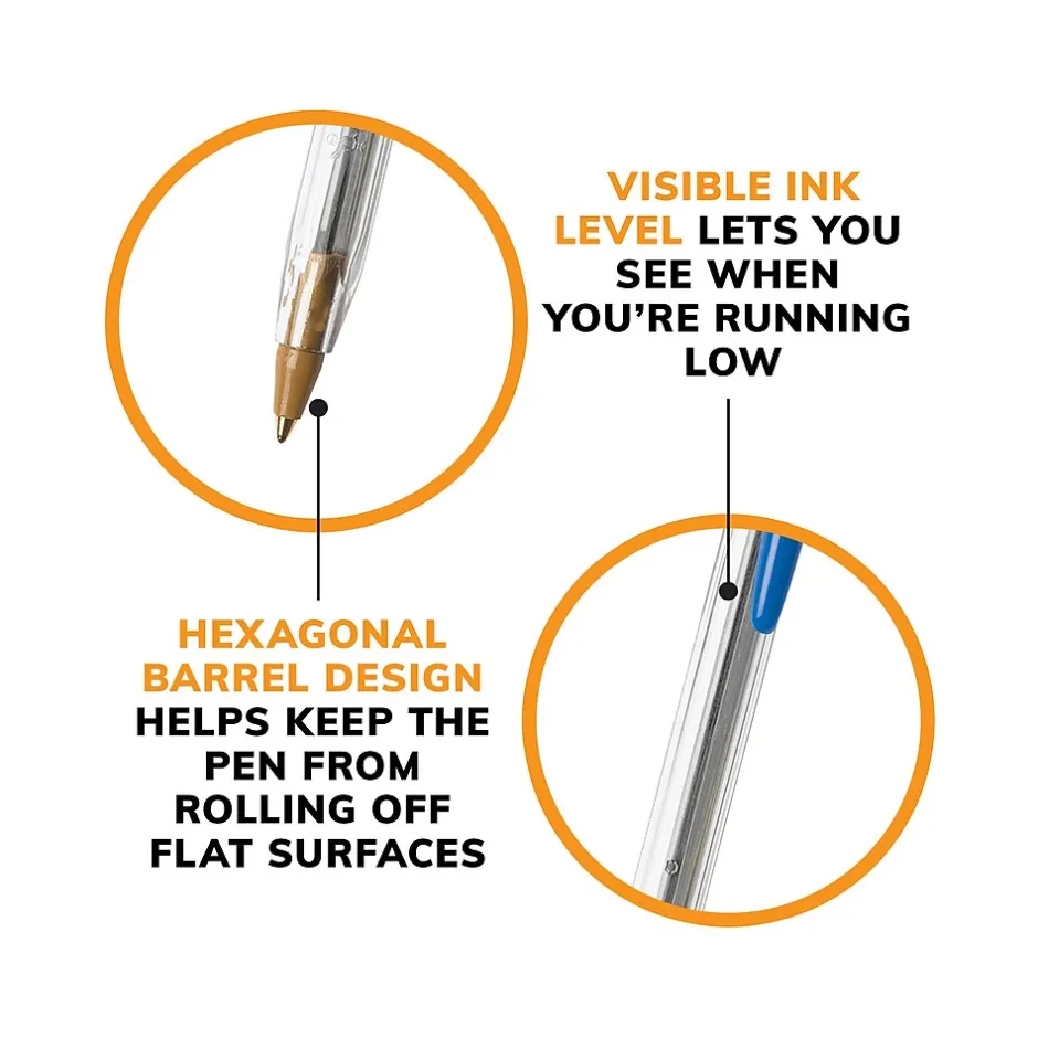 Combine exceptional performance and longevity with the BIC Cristal Xtra Smooth blue ballpoint pen. The flexible 1.0mm medium-point pen delivers crisp, legible lines, making this pen a superb choice for everyday writing activities. The pen minimizes blotting and skipping, as the tungsten carbide ball helps the blue ink spread evenly. The BIC Cristal Xtra Smooth pen has a snug, comfortable grip and a clear hexagonal barrel that lets you see how much ink remains. The matching cap includes a handy clip for easy attachment to pockets or notebooks.