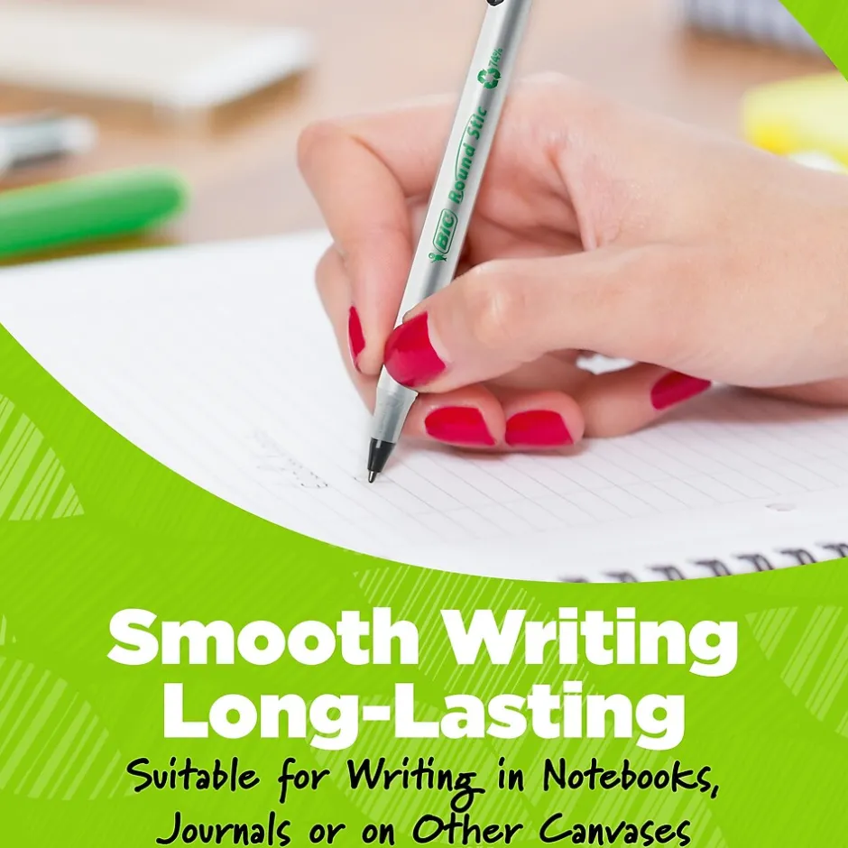This ball pen is not only made from 97% recycled plastic excluding ink cartridge, but the paperboard used in the packaging is made up of 100% recycled content and is also recyclable. With a medium 1.0 mm ballpoint, it’s the perfect BIC pen for everyday writing. The smooth writing ink system delivers hours of effortless writing – this pen is proven to write 90% longer on average than PaperMate InkJoy 100 Stick Ball Pen(1). A classic, slender, semi-clear barrel acts as a handy window when checking pen ink levels. These blue ink pens are suitable for righties and lefties, as the blue ink dries quickly to prevent smearing. Use the convenient clip to hook the ink pen onto your pocket or notebook. Looking for larger quantities of office or school supplies? Choose these bulk pens, which contain 50 blue pens. Pick up BIC Ecolutions Round Stic Ballpoint Pen for a high-quality, affordable writing utensil you can trust. (1)PaperMate and InkJoy are trademarks of Newell or an affiliate. Newell has not sponsored or approved and is not affiliated with this BIC branded product.