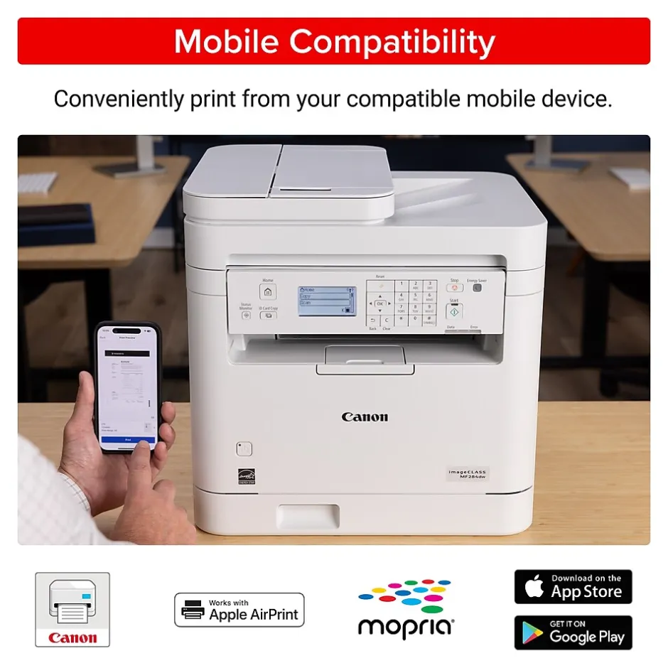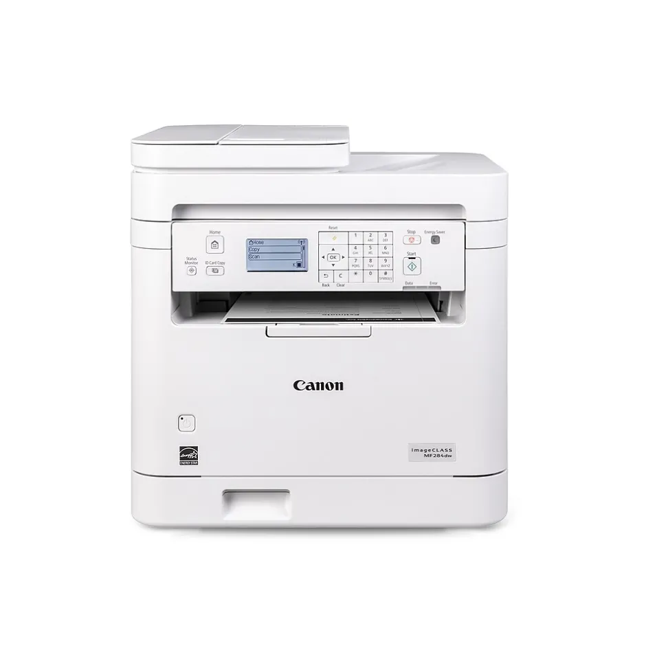 Designed for small office environments, the imageCLASS MF284dw model balances speedy performance and minimal maintenance. The MF284dw is easy to set up and offers media versatility to print on a variety of media types and sizes. Produce crisp, bold documents with fast print speeds of up to 35 pages per minute, using high quality Canon Genuine Toner 072 / 072 H. The MF284dw offers paper capacity of up to 250 sheets in the paper tray and 35-sheet (1-sided) document feeder. The 5-line, adjustable touchscreen delivers an intuitive user experience. Easily connect and print through wirelessly from computers or mobile devices. Print using a variety of mobile apps, including the Canon PRINT app using your compatible mobile device. The MF284dw is also Chromebook compatible, so you can print schoolwork and other documents hassle-free. The MF284dw comes with a 1-year limited warranty and is backed by Canon’s Service and Support network.