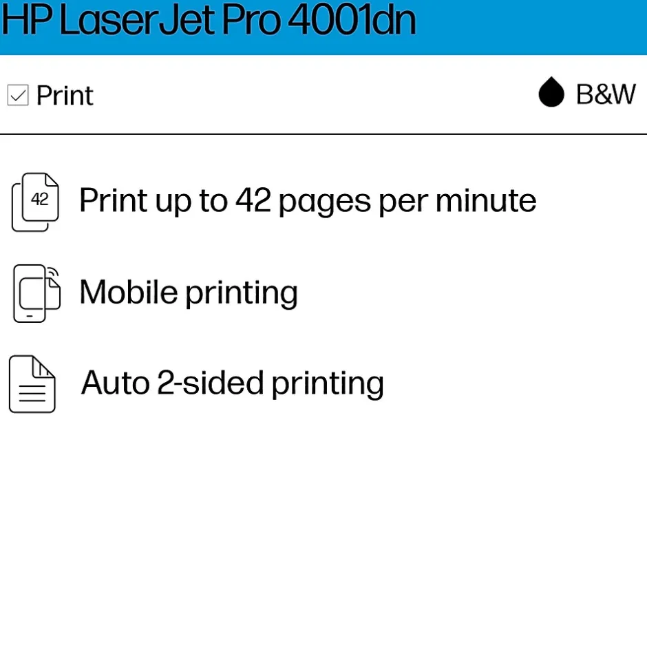 The LaserJet Pro 4001dn delivers laser quality black & white printing for all your business documents. Get ultra-fast speeds, auto 2-sided printing, and powerful productivity with advanced features for small teams. Share among users on your office network with wired ethernet connectivity.