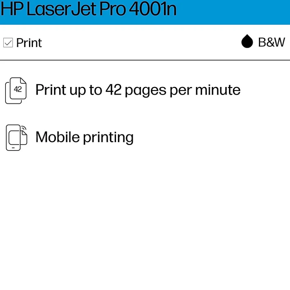 The LaserJet Pro 4001n delivers laser quality black & white printing for all your business documents. Get ultra-fast speeds and powerful productivity with advanced features for small teams. Share among users on your office network with wired ethernet connectivity.