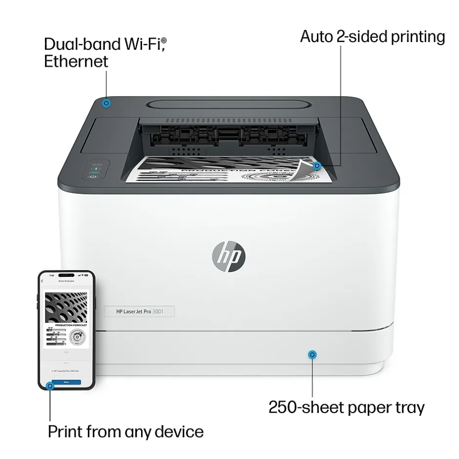 Get fast speeds and powerful productivity with the LaserJet Pro 3001dw. Get laser quality black & white printing for all your business documents. Set up and manage printers in multiple locations with a single dashboard.