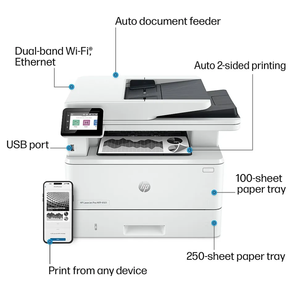 Get fast speeds and powerful productivity with the LaserJet Pro MFP 4101fdw. Get laser quality black & white printing for all your business documents. Super fast and super easy with advanced features for small teams.