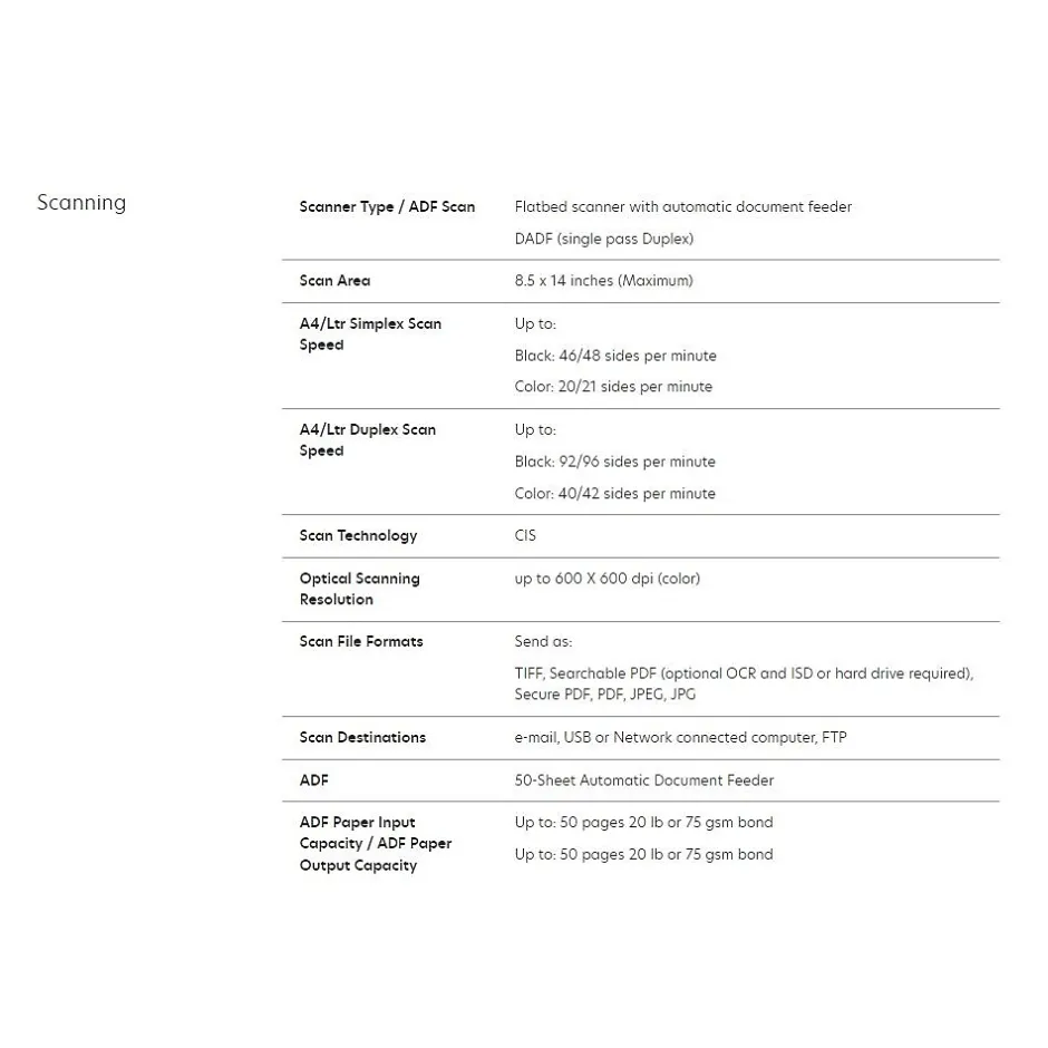 | Printer Function Refers to the methods that can be used to print from the printer. For example, a USB and Wireless printer can be connected to either wirelessly or through a USB cord to print a document. | USB, Wireless, Network Ready |