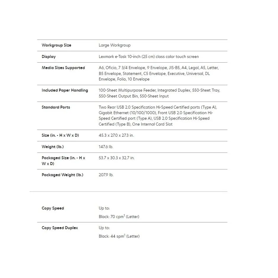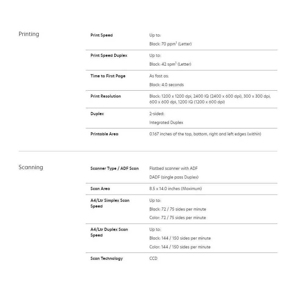 | Automatic Document Feeder (ADF) Print Speed, measured in pages per minute (PPM), specifies the amount of black and white pages that the printer can produce within 60 seconds. | 41 PPM & Up |