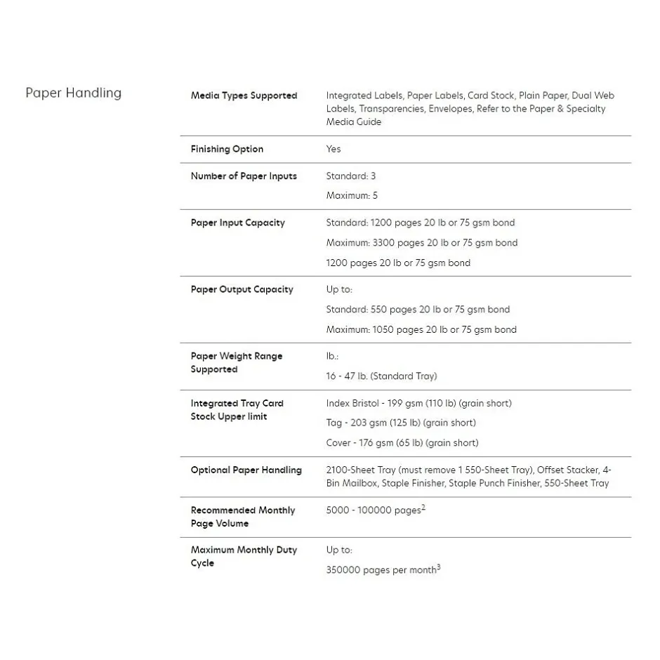 - Robust paper handling supports reliable feeding of a wide range of media types and sizes and the included high-capacity feeder raises total standard input up to 2,750 sheets