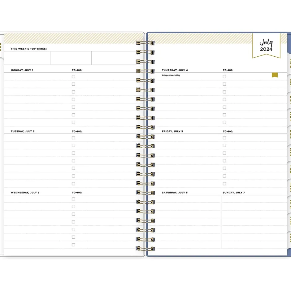 - Weekly and monthly academic planner covers a 12-month date range from July 2024 to June 2025