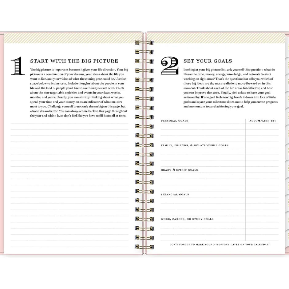 - Includes a storage pocket, gold-tone foil stickers, yearly overview, and goal setting pages