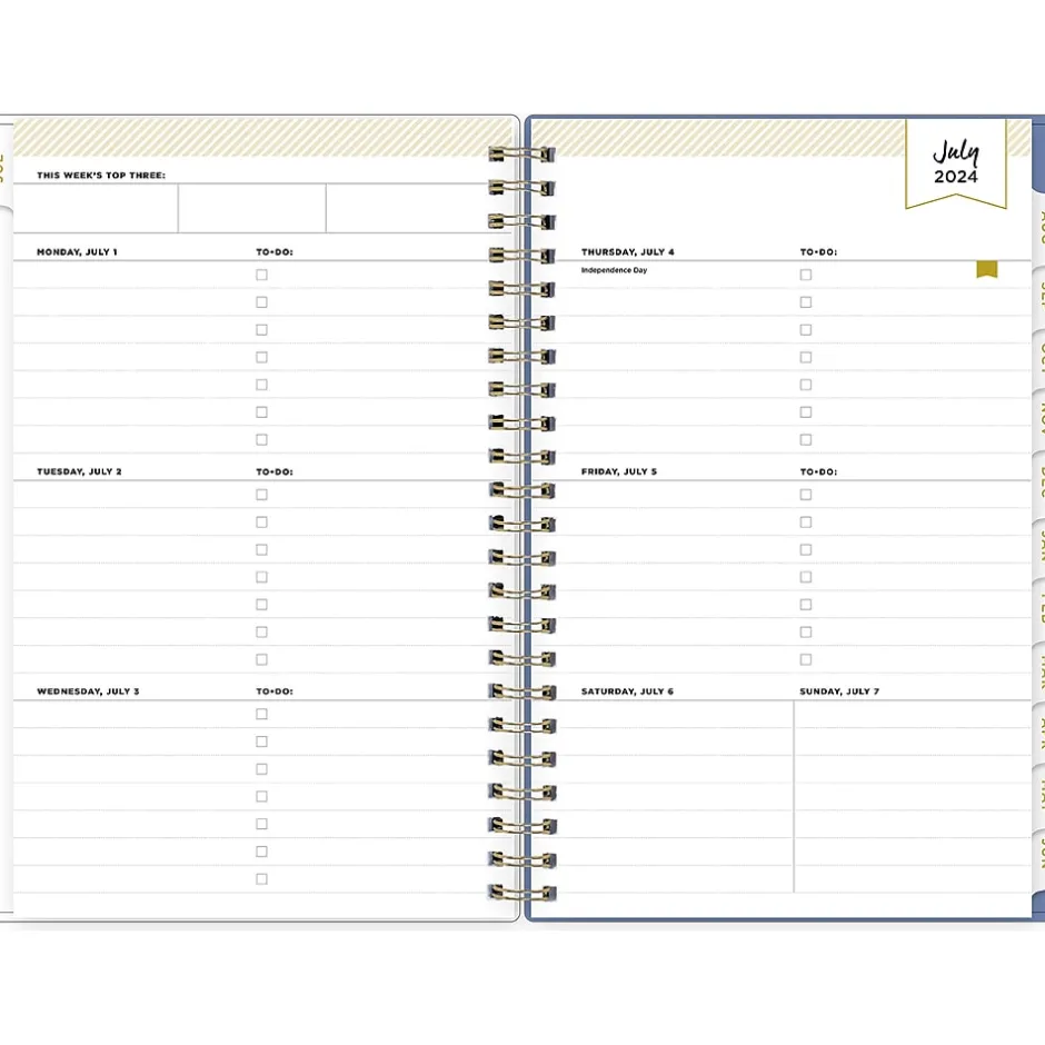 - Weekly and monthly planner covers a 12-month academic date range from July 2024 to June 2025