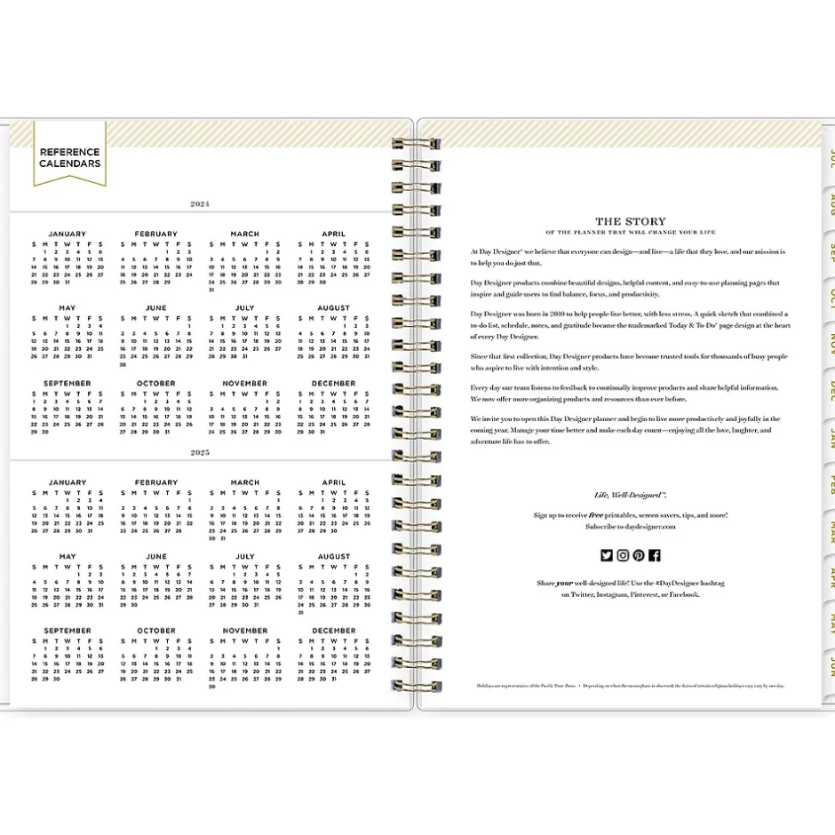 - Offers one month per two pages and one week per two pages, with space for notes and quick reference calendars