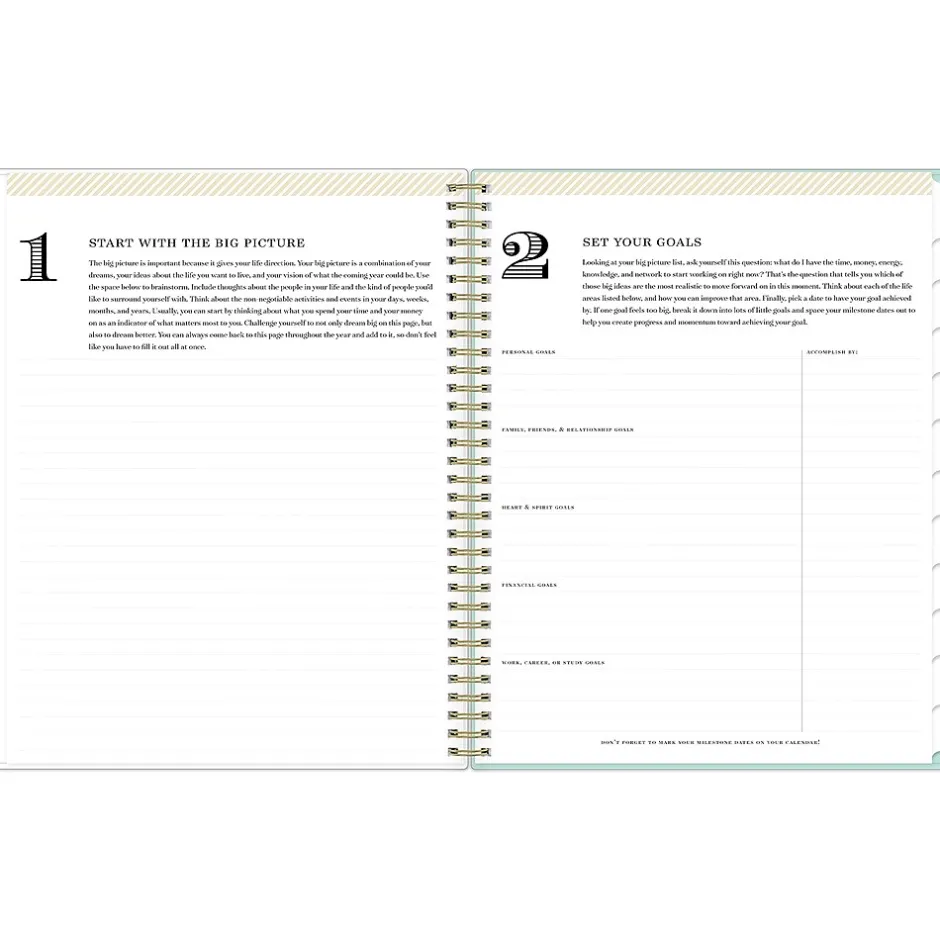 - Includes gold-tone foil stickers, a yearly overview, and goal setting pages