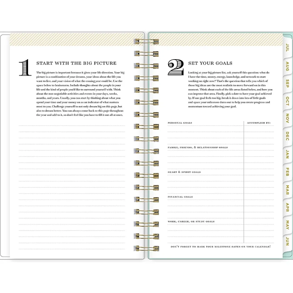 - One week per view, one month per view, yearly overview, goals, contacts, and important dates