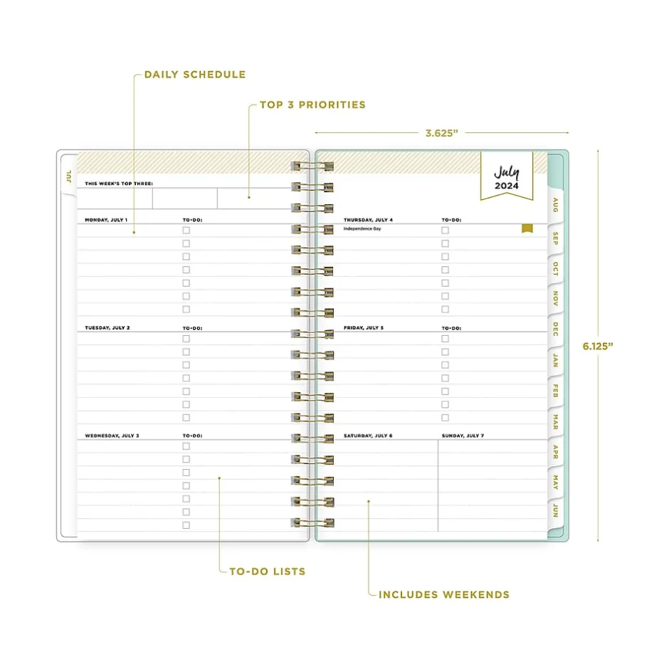 - Weekly and monthly academic planner covers a 12-month date range from July 2024 through June 2025