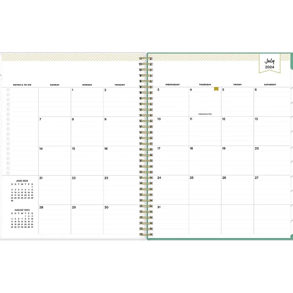 - Weekly and monthly planner covers a 12-month academic date range from July 2024 to June 2025