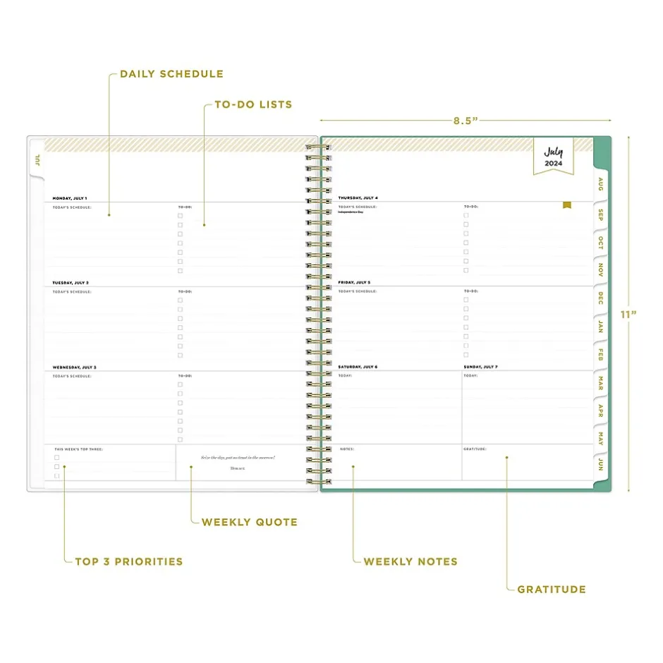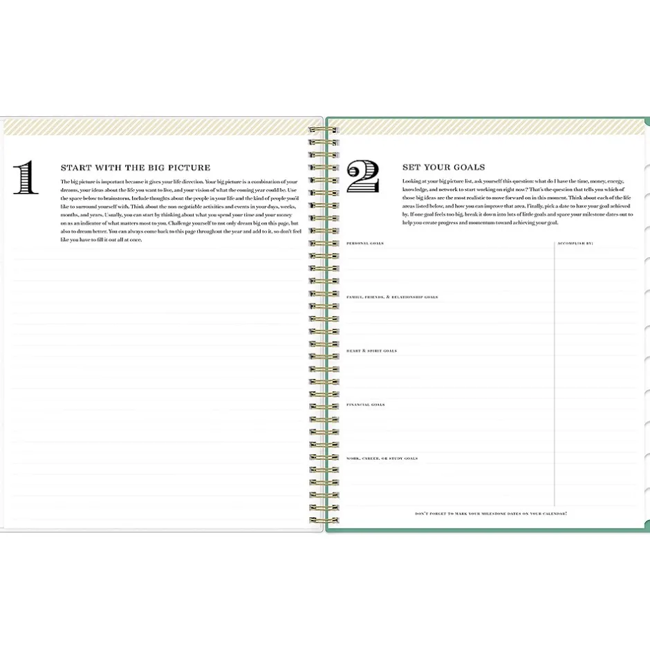 - One week per two-page spread with top three, notes, and gratitude sections; one month per two-page spread with notes and to-do sections; yearly overview and goal-setting pages