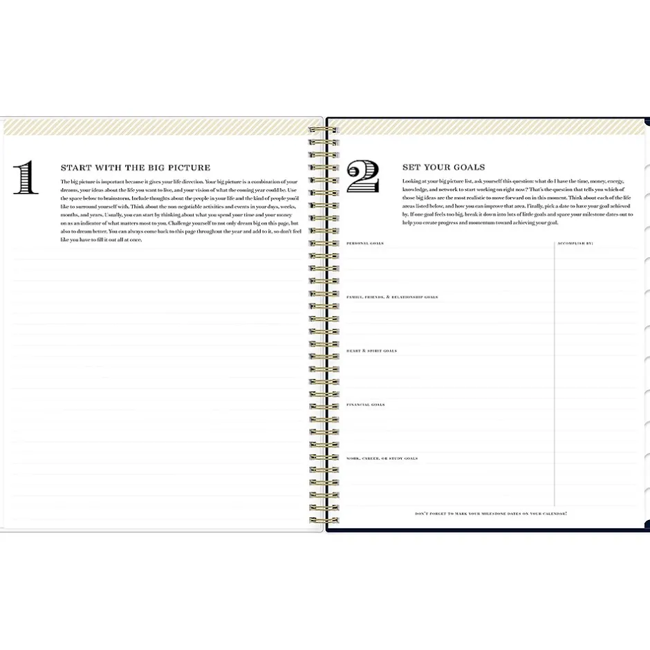 - Features one month per two pages and one week per two pages, with four-step guide to goal setting, two-year reference calendar, weekly quotes, and space for notes