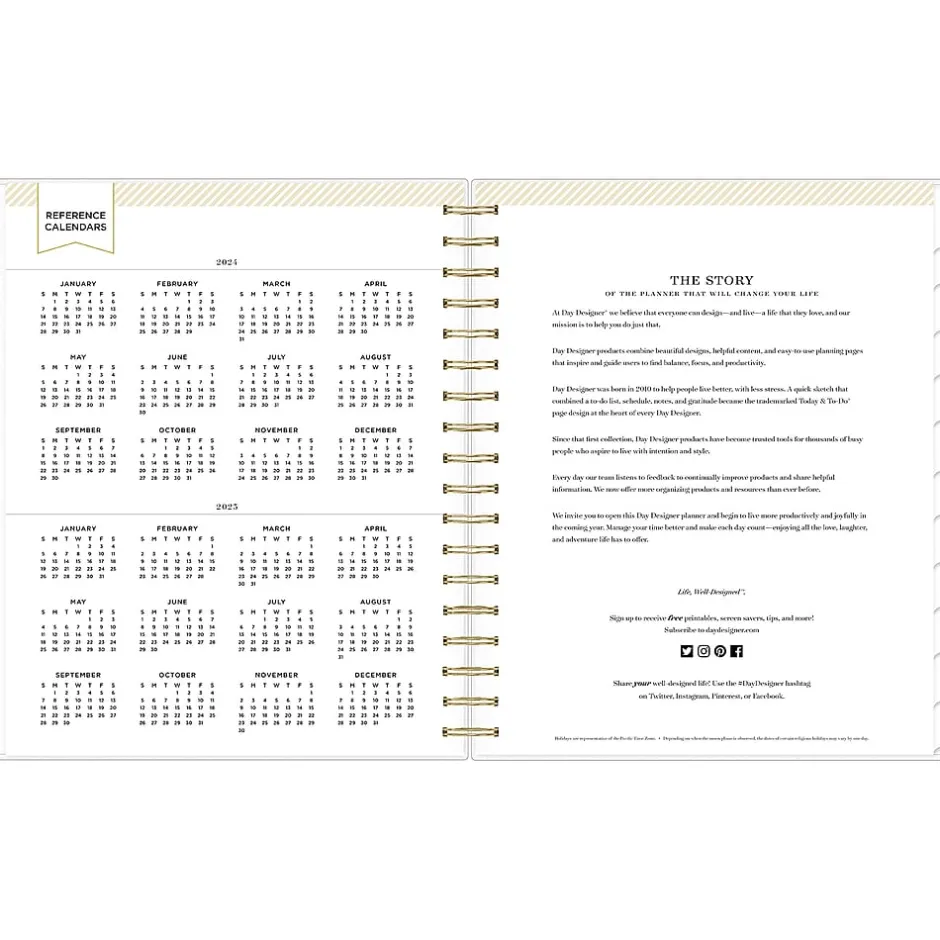 Design your year with Day Designer for Blue Sky academic planners. The Rugby Stripe 2024-2025 daily and monthly planner has hourly planning pages to manage a busy schedule and time-block activities. One page per weekday, and weekends appear on the same page. Includes tabbed monthly views, a storage pocket, stickers, and goal-setting pages.