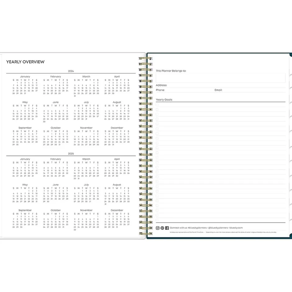 - Includes notes pages, reference calendars, contacts, goals, holidays, and important dates