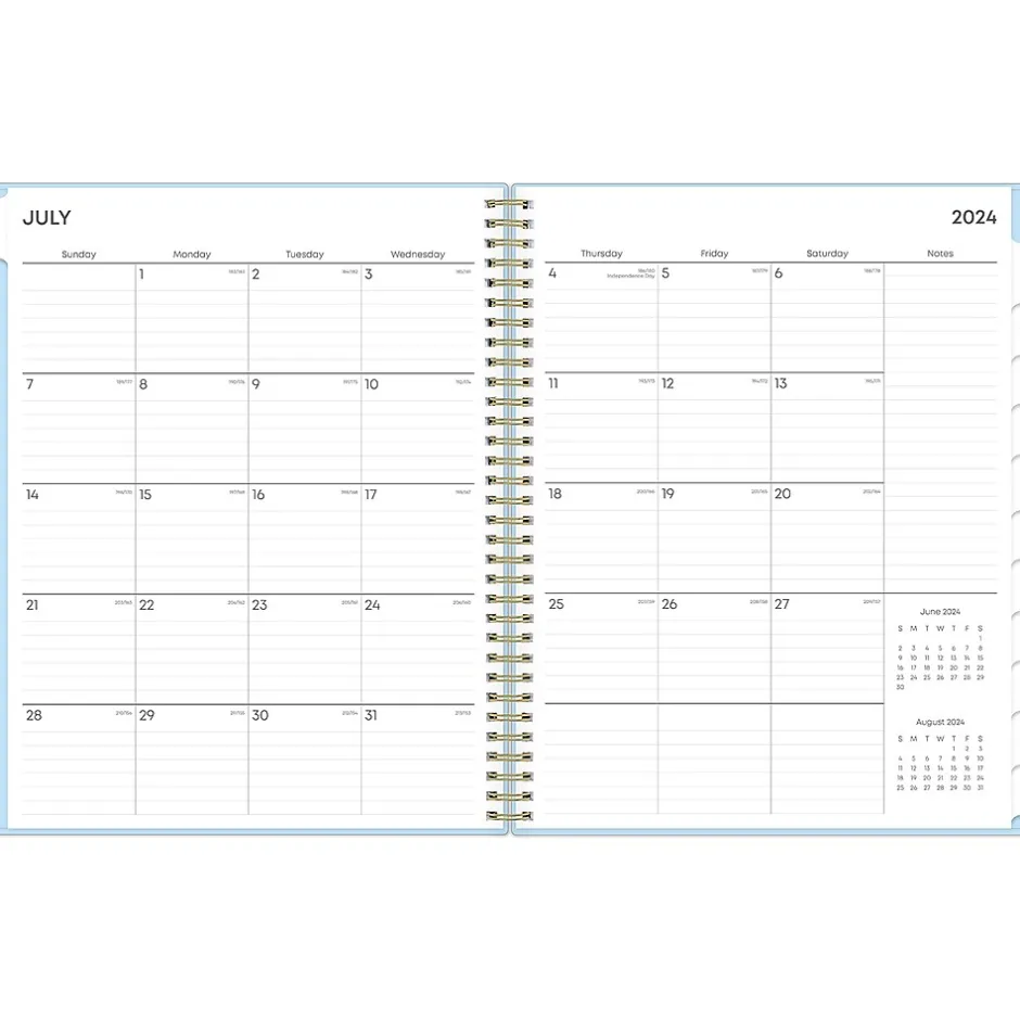 - Features one month per two pages and one week per two pages, with space for notes and quick reference calendars