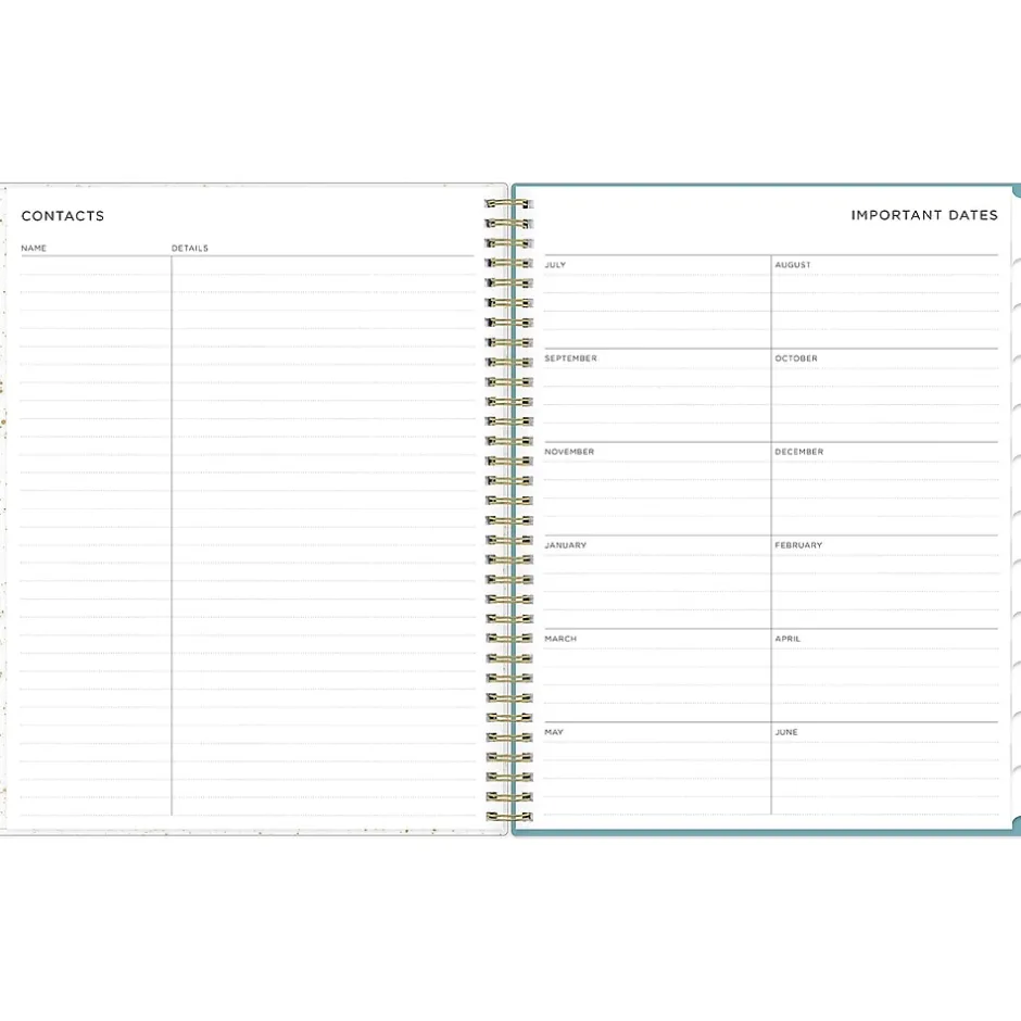 - Features one month per two pages and one week per two pages, with important dates, holiday list, contacts, and notes