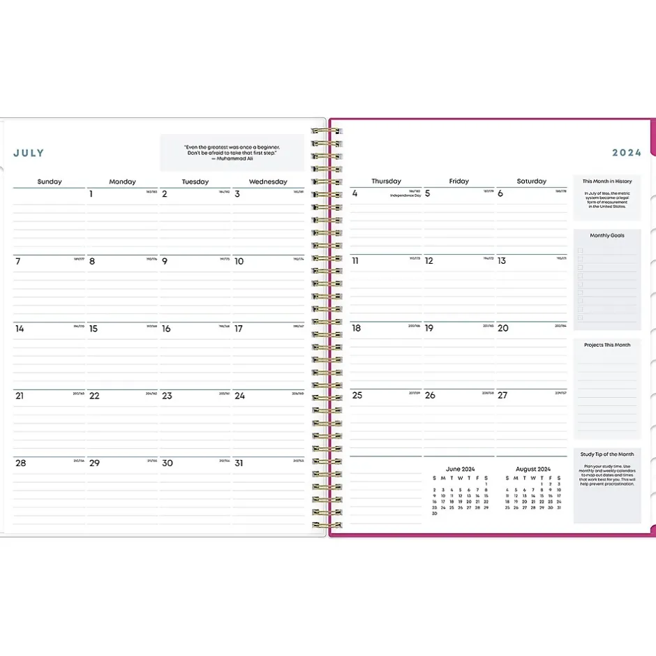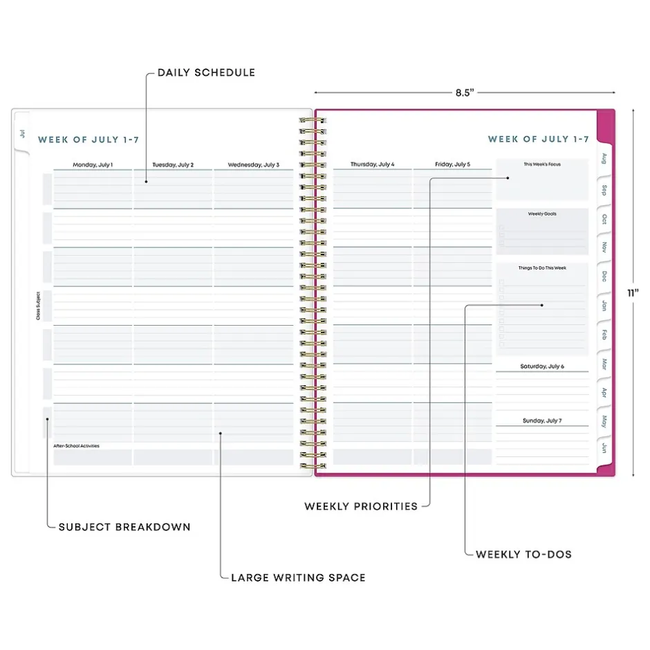 - Features one month per two pages and one week per two pages, with monthly quotes, weekly goals, projects this month section, class schedule, assignment and project tracker